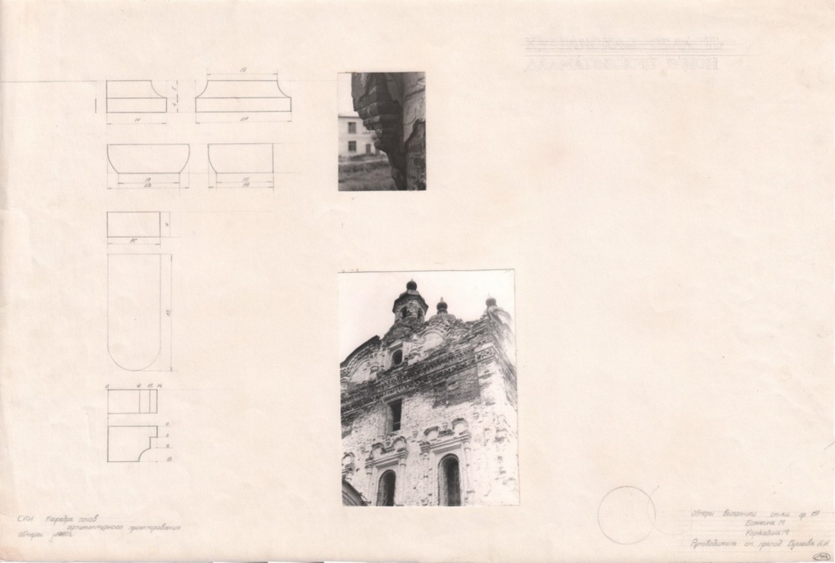 По притокам реки Исеть (Церкви). Материалы обмерной практики. Лист 14. Церковь с. Першино. Лекало кирпичей, фотографии | 1980 г.