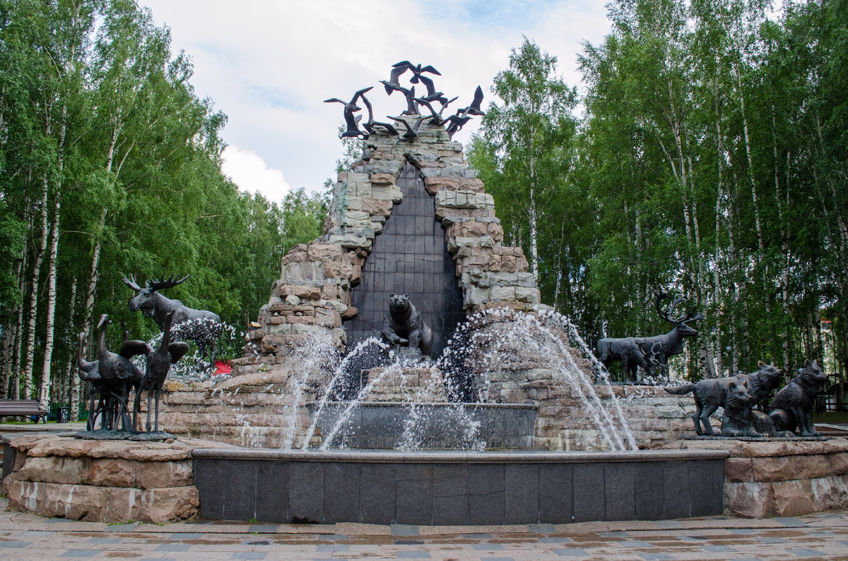Знакомство с Ханты-Мансийском мы начали с парка имени Бориса Лосева. Тут расположена впечатляющая композиция из фонтанов, которая словно запечатлела фауну Югры в камне.