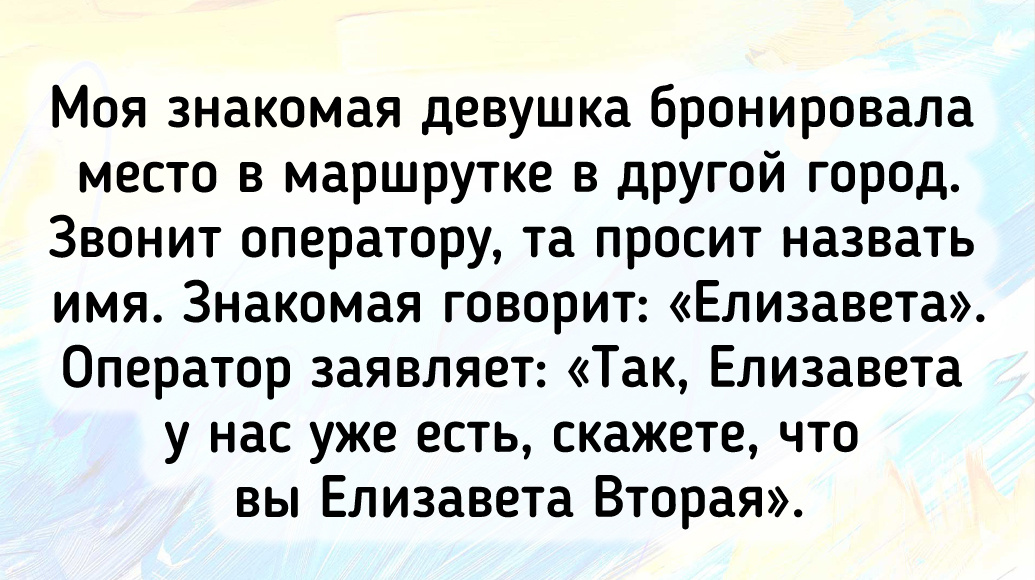 - Моя знакомая девушка бронировала место в маршрутке в другой город. Звонит оператору, та просит назвать имя. Знакомая говорит: «Елизавета». Оператор заявляет: «Так, Елизавета у нас уже есть, скажете, что вы Елизавета Вторая». © kaja.nika / Pikabu