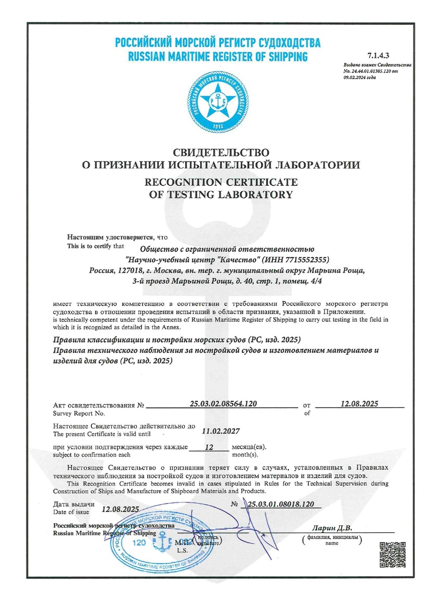 ООО "НУЦ "Качество" сообщает о значимом шаге в развитии своих технических возможностей. Российский Морской Регистр Судоходства официально расширил область признания нашей испытательной лаборатории, включив в нее новый, стратегически важный пункт - «Аналитические испытания». Этот шаг является закономерным результатом нашей целенаправленной работы по усилению компетенций и расширению спектра услуг для предприятий судостроительной и смежных отраслей. Полученное признание со стороны столь авторитетного органа не только подтверждает высокий профессиональный уровень наших специалистов, но и открывает для наших клиентов новые возможности. Отныне наша лаборатория уполномочена проводить комплекс высокоточных аналитических испытаний, включая: Что это значит на практике? Получение этого разрешения позволяет нам оказывать более полный цикл услуг по оценке качества и безопасности материалов, используемых в судостроении. Мы можем не только фиксировать соответствие стандартам, но и проводить глубокую