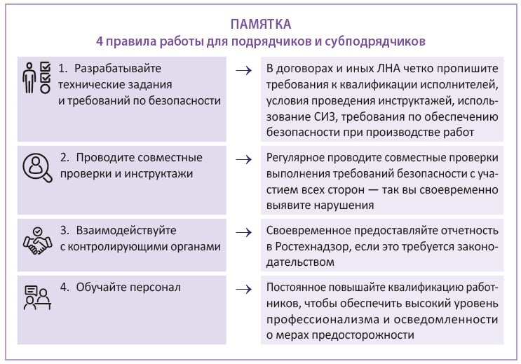 📍 Дарим статью из нового номера журнала «Промышленная безопасность. Разъяснения. Вопросы и ответы»! Работа подрядчиков и субподрядчиков на ОПО: обеспечение безопасности и юридические аспекты 👉 Скачать статью бесплатно можно по ссылке Эксплуатация ОПО подразумевает поддержание на нем в исправном состоянии технических устройств, зданий и сооружений. Такие работы могут выполняться персоналом эксплуатирующей организации, а также персоналом сторонней организации-подрядчика. Читайте в статье, как выполнить требования промышленной безопасности и обеспечить безопасность работников со стороны не эксплуатирующей, а подрядной (субподрядной) организации. ✅ Особенности работы подрядчиков и субподрядчиков на ОПО. ✅ Нормативные требования к обеспечению безопасности при выполнении работ. ✅ Что подрядчик (субподрядчик) должен решить с заказчиком перед началом работ. ✅ Как отразить требования к безопасности в документах между заказчиком и подрядчиком.