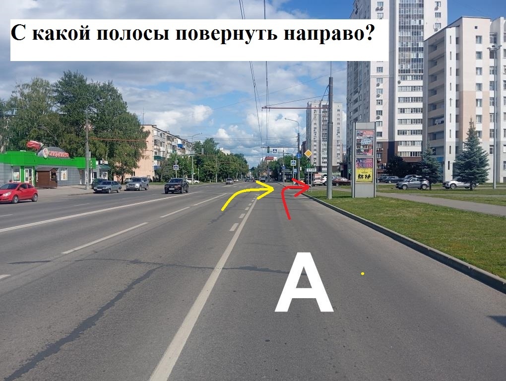 Нарушение: Если нужно осуществлять поворот с полосы для маршрутных транспортных средств, но водитель нарушил ПДД РФ и допускает поворот направо со второй полосы.