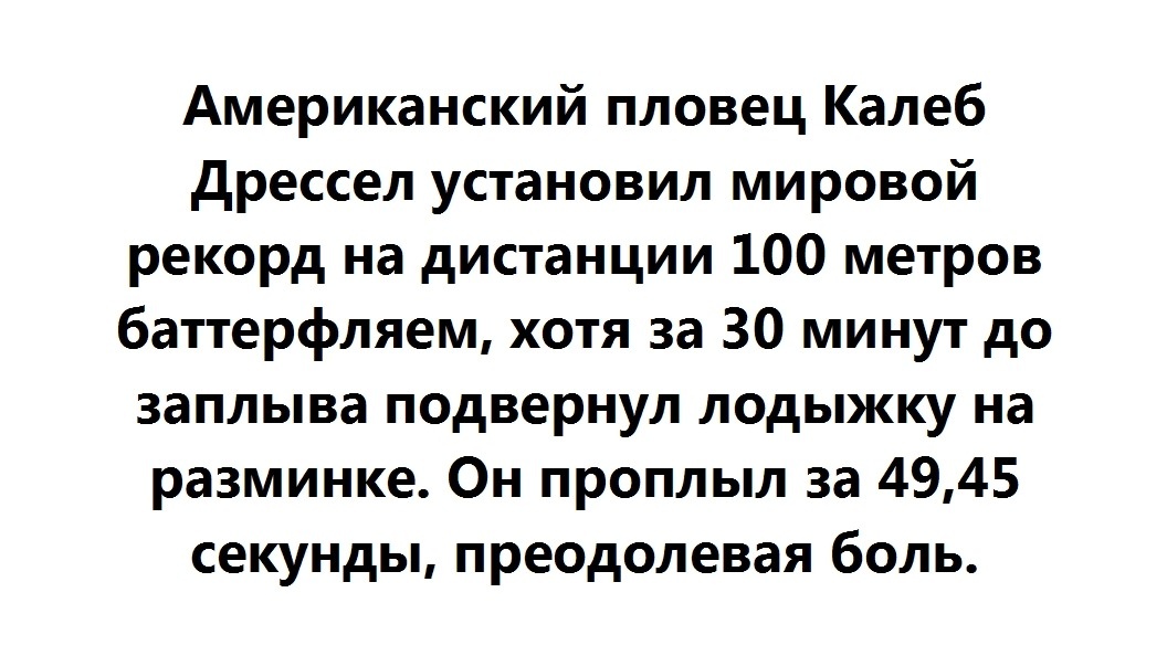 - Американский пловец Калеб Дрессел установил мировой рекорд на дистанции 100 метров баттерфляем, хотя за 30 минут до заплыва подвернул лодыжку на разминке. Он проплыл за 49,45 секунды, преодолевая боль.