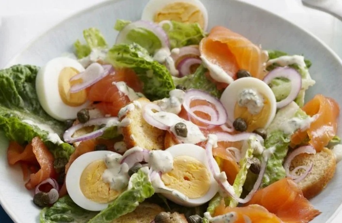 - Для салата выбирайте слабосолёную рыбу: сёмгу, форель, горбушу. Выньте выбранную рыбу из упаковки, очистите от кожи и костей. Нарежьте рыбу небольшими кубиками. Вторым слоем выложите картофель поверх нарезанной рыбы. Сразу же посыпьте сверху нарезанным луком – зелёным или салатным. Какой бы лук ни был выбран, в слоеном салате он пропитается и не будет горчить. Промажьте этот слой небольшим количеством майонеза.