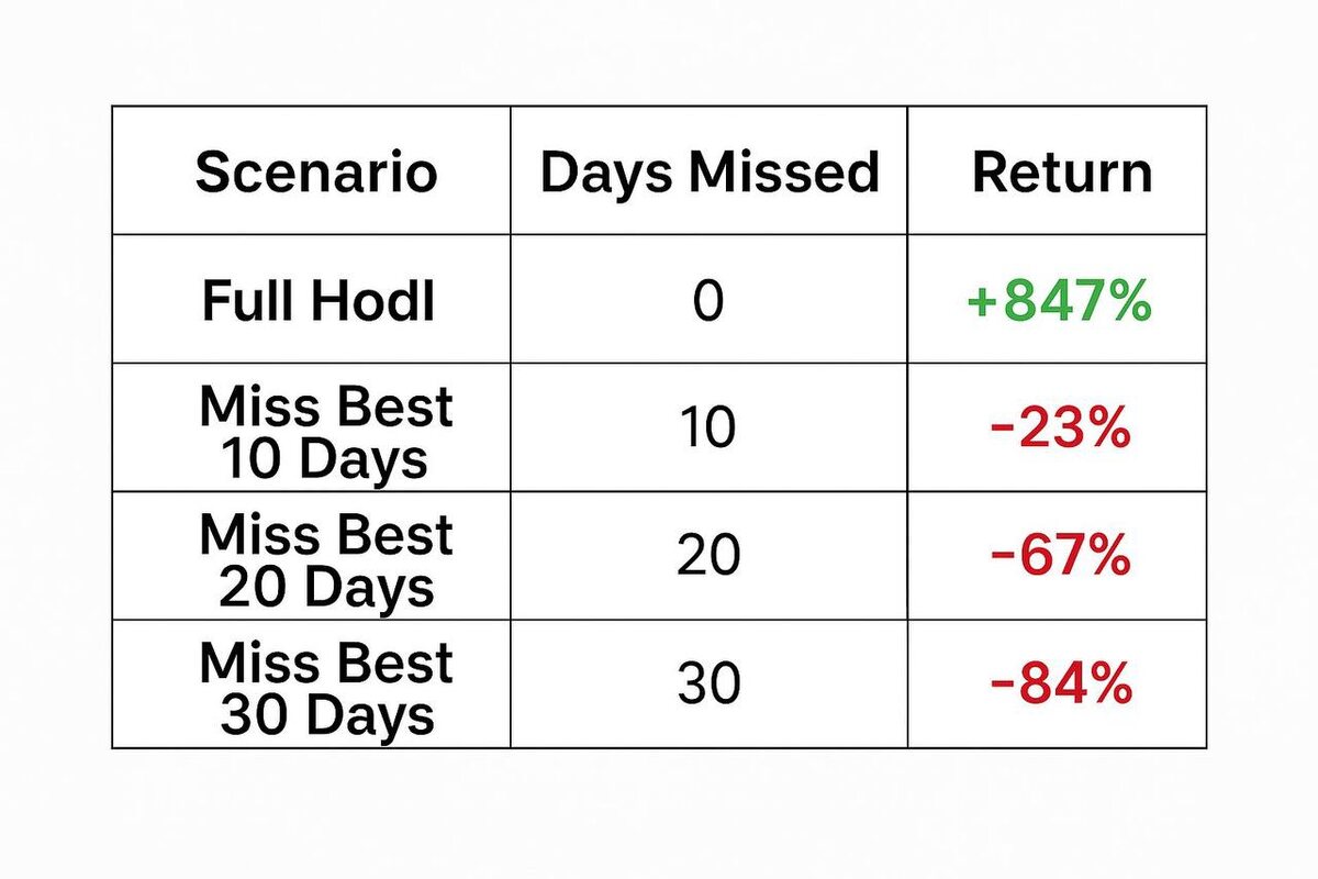 10 дней, которые решают всё Если бы вы просто держали биткоин с 2017 по 2024 — доход составил бы +847%. Но если вы пропустили всего 10 лучших дней роста — результат превращается в -23%. Пропустили 20 дней — -67%, а 30 дней — -84%. Большинство прибыли в биткоине рождается в считанные вспышки — дни, когда рынок выстреливает так, что кажется, будто “поздно заходить”. Именно в эти дни толпа в панике стоит в стороне, а система вознаграждает терпеливых. Проблема не в том, что люди не знают, когда покупать. Проблема в том, что они пытаются угадать, когда выйти и вернуться. И вот это стоит им десятков иксов. Главная мысль: не пытайтесь перехитрить цикл. Тайминг уничтожает доходность, дисциплина умножает её. Биткоин награждает не тех, кто угадывает, а тех, кто просто держит. #биткоин #инвестиции #hodl #цикл