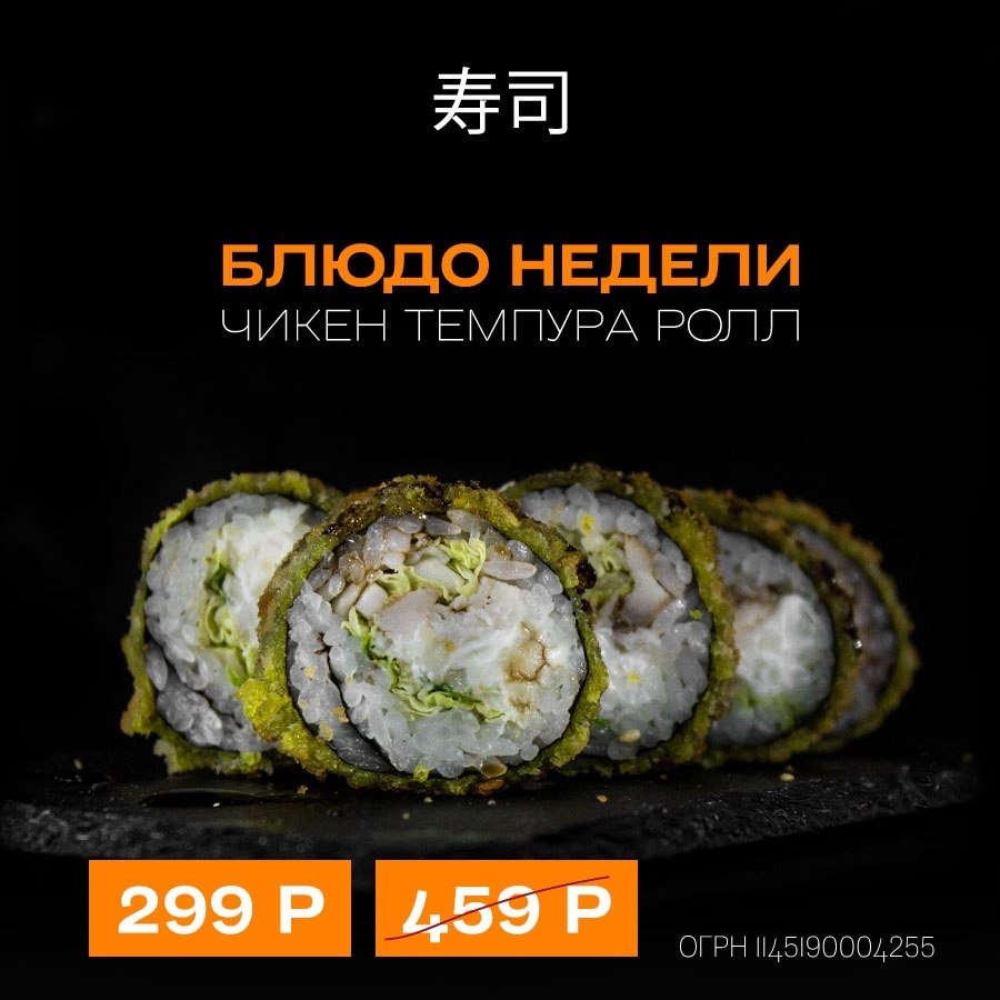 🍣 Акции недели в нашем ресторане! 🔥 Блюдо недели — Чикен темпура ролл всего за 299₽ вместо 399₽! Состав: рис, нори, курица сувид, творожный сыр, пекинский салат, темпура, соус унаги, кунжут микс. 8 шт / 230 г. * Не более 1 позиции на чек и гостя. 🎁 Ролл в подарок — Дерзкий кани ролл при заказе от 2025₽! Состав: рис, нори, снежный краб, творожный сыр, огурец, сырный и унаги соусы, кунжут. 180 г / 5 шт. Ежедневно с 11:00 до 23:00 * Акция действует с 21 по 31 октября 2025 г. * Не суммируется с другими скидками и бонусами. Заказывайте вкусно и выгодно!