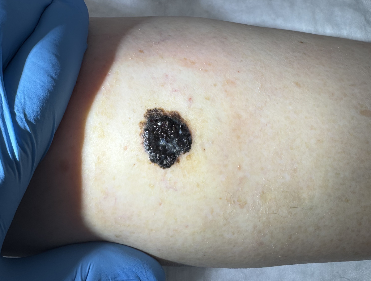 Появление пигментного новообразования на коже голени пациентка заметила около 10 лет назад. Около 2 лет назад новообразование начало видоизменяться: увеличилось в размерах, приобрело черный цвет, приподнялось над поверхностью кожи. Затем появились жалобы на контактную кровоточивость. Естественно первое, о чем может подумать онколог при виде подобного новообразования – это пигментная меланома. При пальпации периферические лимфоузлы были в норме (меланома кожи голени метастазирует в первую очередь в подколенные и паховые лимфоузлы). Пациентка длительно не обращалась за медицинской помощью из-за страха. На консультации я долго объяснял предполагаемый диагноз и последствия, с которыми придется столкнуться, если тянуть время дальше. Мне удалось убедить пациентку в серьезности её положения, и она согласилась на эксцизионную биопсию – то есть удаление новообразования в пределах здоровых тканей с отступом в 5 мм от видимых границ опухоли. Под местной анестезией я выполнил эксцизионную биопсию