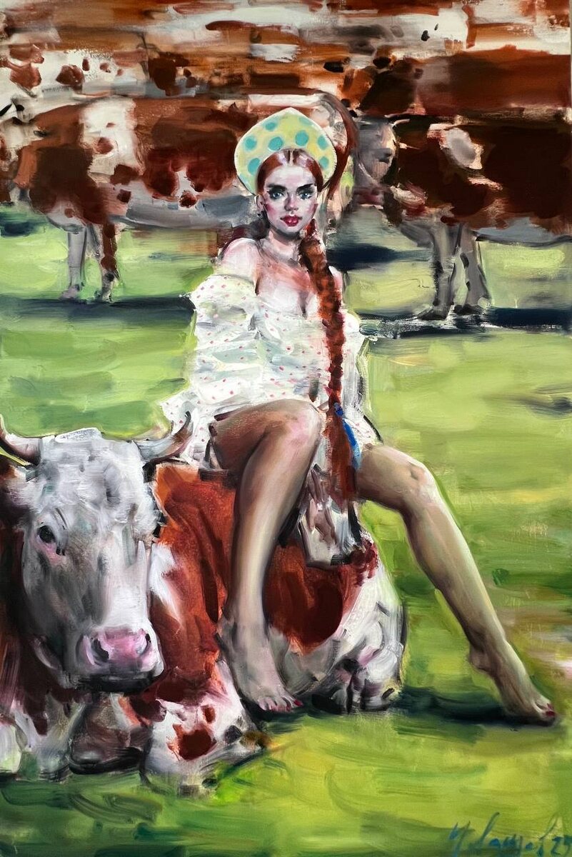 Отдельное направление в серии отдано художником сельской романтике. На фоне зелёных лугов и коров девушки выглядят как будто избыточно нарядными. На картине «Среди коров» героиня сидит в летнем шифоновом платье прямо на Буренке, голову девушки венчает яркий кокошник горохами, повторяющий тон травы. Вся атмосфера вокруг напоминает веселый летний праздник, где и коровы и девушки одинаково прекрасны. ••• Разобраться в женском образе дня сегодняшнего можно на выставке Александра Чувашева «Рашен НЮ» в галерее YOLKA art до 10 ноября 2025. ••• Москва. Ходынский бульвар 20а, с 11:00 до 21:00 ежедневно. Выставка бесплатная, работы продаются. Вся контактная информация на сайте YOLKA.art