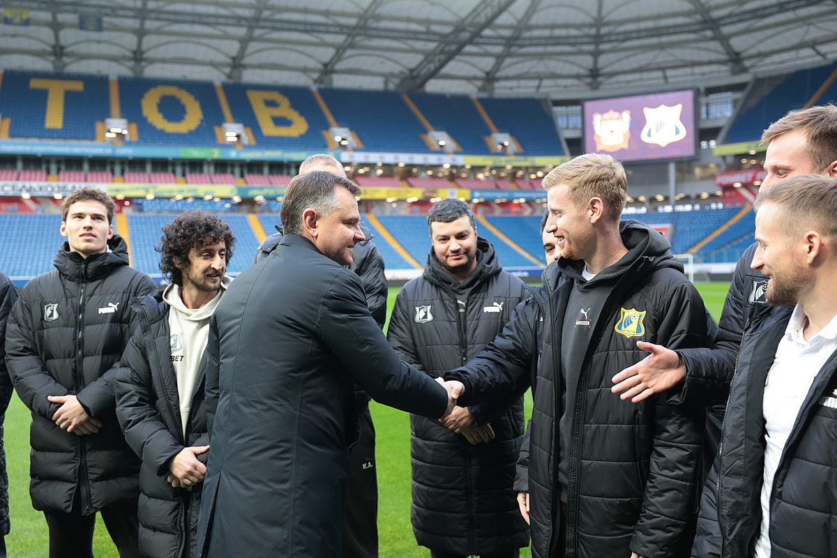 Губернатор Ростовской области Юрий Слюсарь приехал на стадион «Ростов-Арена» и пообщался с игроками, тренерским штабом и менеджментом ФК «Ростов». Спортсмены спросили губернатора о планах развития клуба. Губернатор заверил: никаких потрясений в жизни клуба происходить не должно и не будет. «Вы – гордость нашей области, ростовчан. Огромное количество людей с интересом наблюдают за вами, поддерживают, гордятся вами и болеют за вас. За игрой клуба мне лично очень интересно наблюдать, за это вам огромное спасибо», - обратился к футболистам Юрий Слюсарь. Губернатор подчеркнул, что важно сохранить атмосферу взаимопонимания, которая сложилась в коллективе клуба. «Есть поднакопившиеся финансовые вопросы, это наша часть работы. Задача – финансовую схему сложить так, чтобы выполнить все обязательства, закрыть долги и сделать задел на будущее, на следующий сезон. Ваша – демонстрировать хороший футбол, радуя болельщиков яркими победами. Правительство всегда поддерживало и будет поддерживать донск