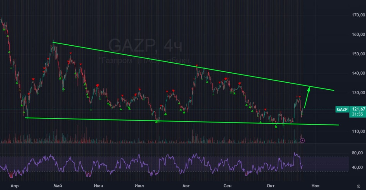 ⛽️ Газпром 🟢 В Газпроме среднесрочная картинка выглядит в сторону 132 рублей - к верхней границе зеленого клина/треугольника. В случае его прорыва вверх, будет выход на его высоту. А это примерно 168 рублей. 🚗 Сидим в трегольниках по рынку, ждем позитива со стороны геополитики. #ГАЗПРОМ #GAZP #GAZPF #bogdanoffinvest