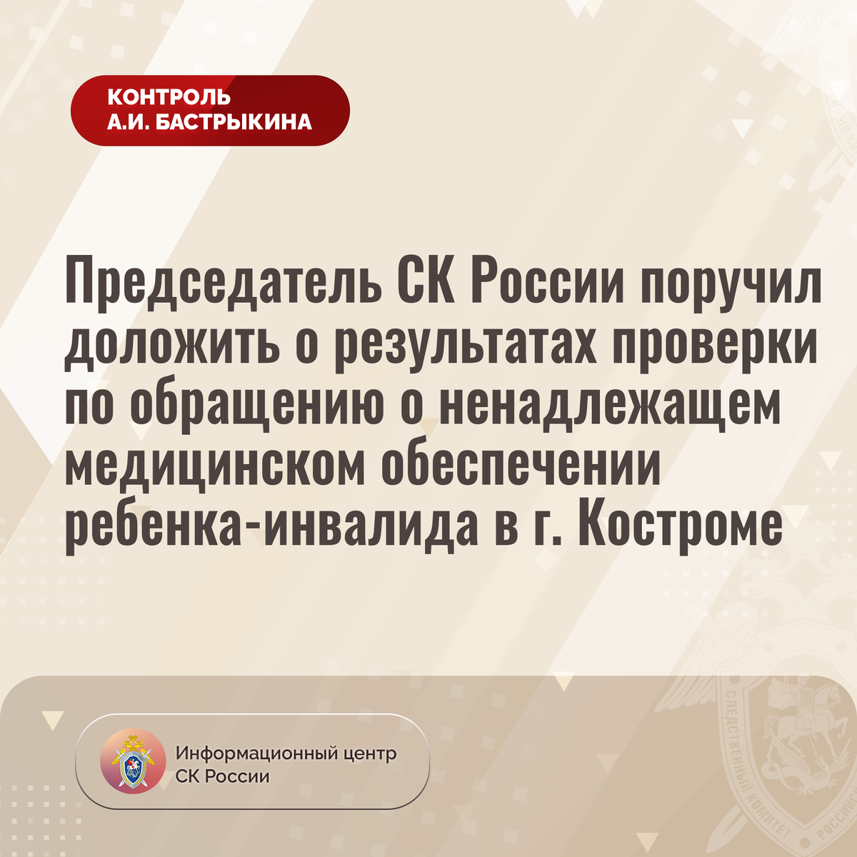 Председатель СК России поручил доложить о результатах проверки по обращению о ненадлежащем медицинском обеспечении ребенка-инвалида в г. Костроме В Информационный центр СК России обратилась жительница города Костромы по вопросу нарушения прав ее 12-летней дочери, являющейся инвалидом, на качественное медицинское обеспечение. В 2022 году девочке назначен прием лекарственного препарата. Несмотря на наличие судебного решения, до настоящего времени закупка медикамента не проведена, ребенок лишен жизненно необходимого лекарства. Многочисленные обращения матери в различные инстанции результатов не принесли. В СУ СК России по Костромской области по поступившему обращению организована процессуальная проверка. Председатель Следственного комитета Российской Федерации Александр Иванович Бастрыкин поручил руководителю СУ СК России по Костромской области Денису Николаевичу Левченко доложить о промежуточных результатах процессуальной проверки и принятом по итогам решении. Исполнение поручения, а так