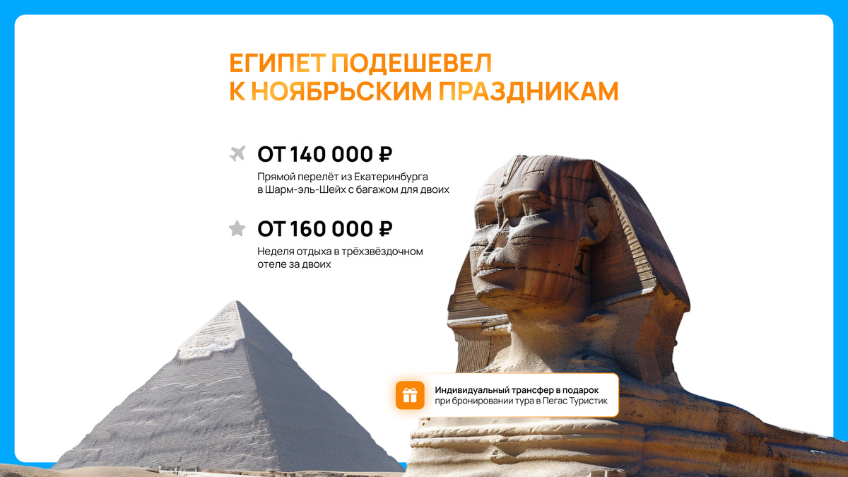 Например, прямой перелёт из Екатеринбурга в Шарм-эль-Шейх с багажом для двоих сейчас обойдётся примерно в 140 000 ₽. А вот недельный тур в Египет с проживанием в трёхзвёздочном отеле, трансфером и перелётом стоит от 160 000 ₽ за двоих. Фактически вы получаете перелёт, проживание и трансфер по цене только билетов – и при этом экономите время на поиске и организации поездки. Пляжный сезон в Египте длится круглый год, а ноябрь – один из самых комфортных месяцев для отдыха.