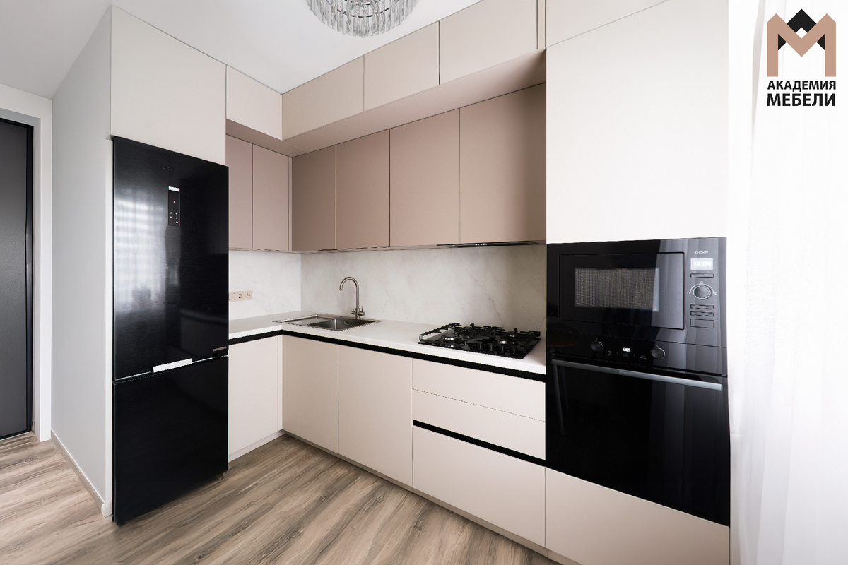Здесь органично сочетаются оттенки: легкий «Французский серый» и «Тёплый софт мокко». На фасадах МДФ они визуально выделяют кухню. Корпус Lamarti «Теффи L» поддерживает эту коминацию. Столешница и стеновая панель выполнены из Slotex Kapso «Мрамор Бланко» — он дополняет интерьер светлой текстурой, создавая ровный тон для всей рабочей зоны. Соединение выполнено через еврозапил — это не только эстетика, но и практичность, ровный стык без изъянов. Гармония линий достигается не только подбором цветовой гаммы, но и конструктивными решениями. Трёхуровневая планировка: антресольный ряд под потолком открывается от лёгкого нажатия, что визуально делает кухню строгой и современной. Средний ряд — вертикальные распашные шкафы с вытяжкой, сушилкой и вместительными полками. Внизу — зона хранения: встроенная посудомойка, эргономичные выдвижные ящики и отдельный модуль с мойкой и дополнительными полками для повседневной посуды или бакалеи. Врезная светодиодная подсветка рабочей зоны добавляет мягкого