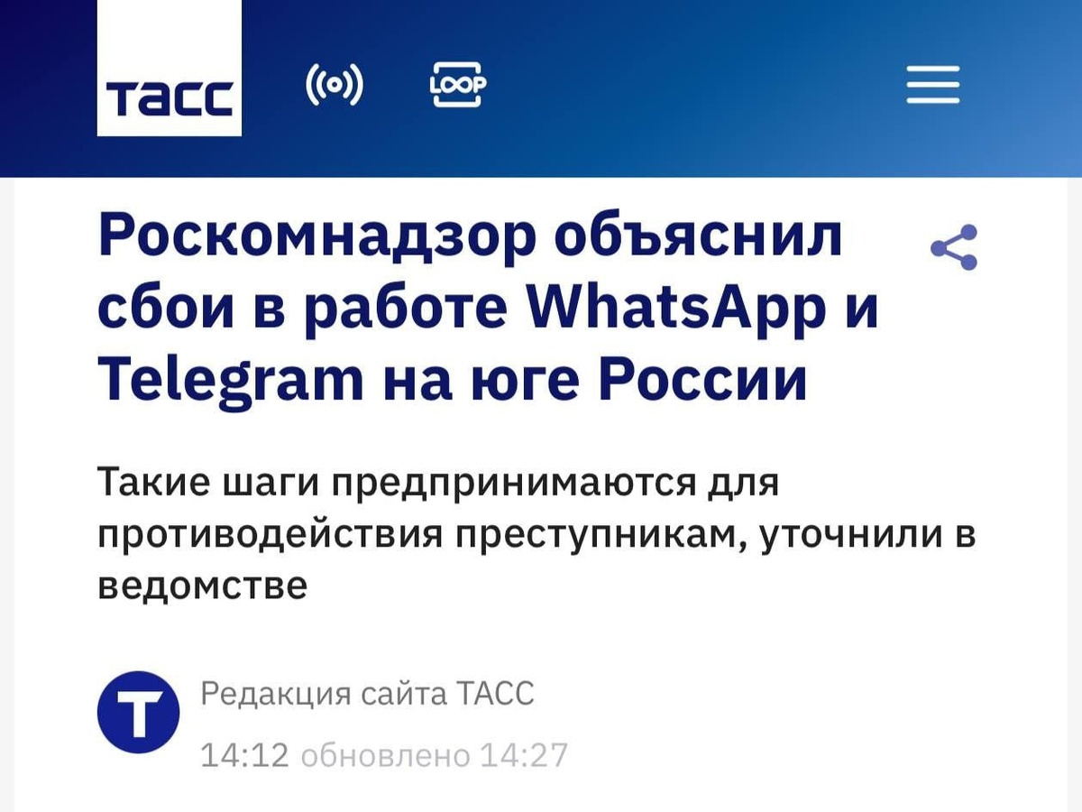 ⚡️ Роскомнадзор подтвердил частичную блокировку Telegram и WhatsApp в ряде регионов «для противодействия преступникам» — это официально
