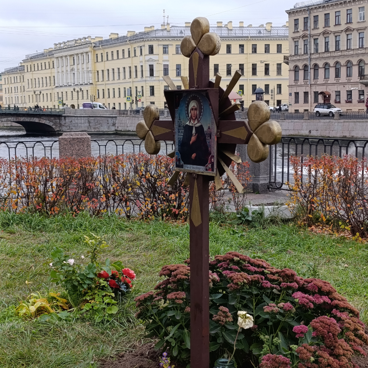 Проезжая мимо на машине с удивлением увидишь крест, а по центру икону, вокруг цветник.