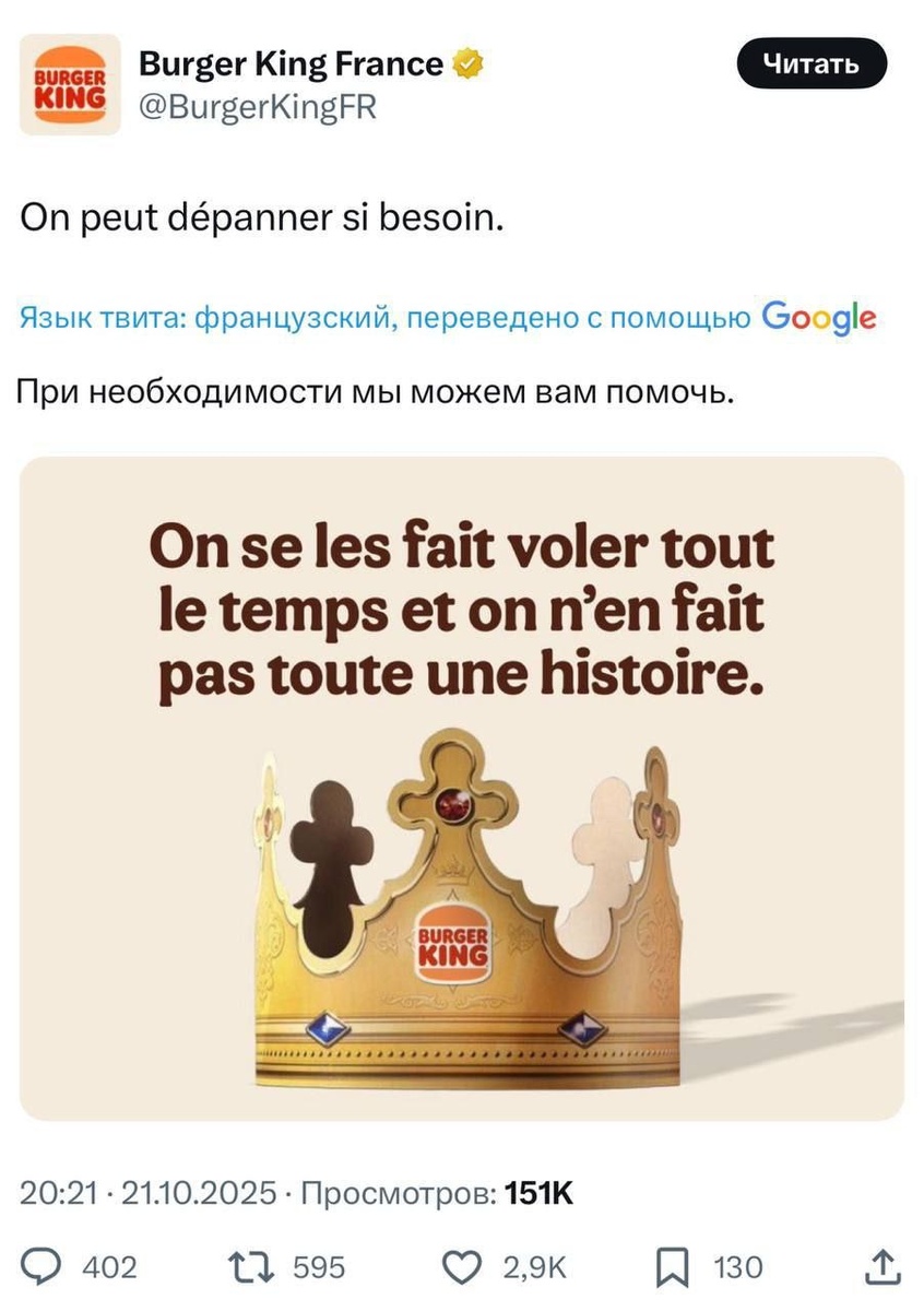 🍔👑 Burger King во Франции в шоке! После ограбления Лувра сеть ресторанов пожаловалась, что у них тоже воруют короны — не только