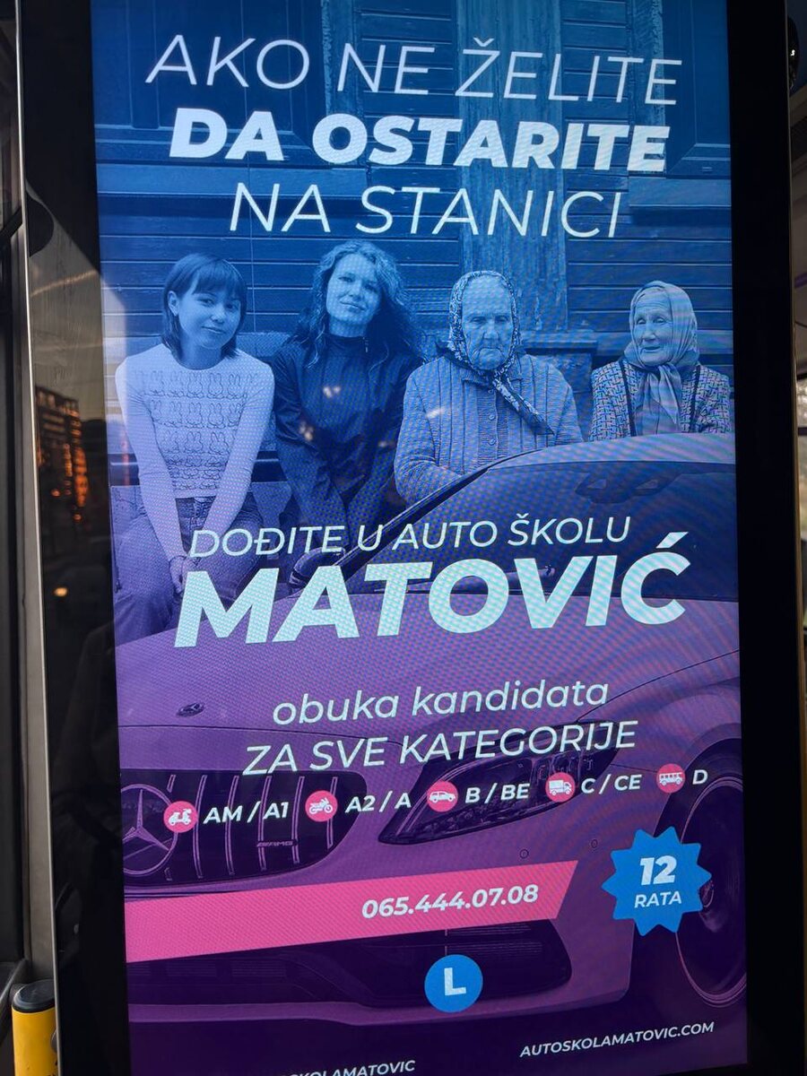 Реклама в автобусе: не хочешь состариться на остановке - иди в автошколу