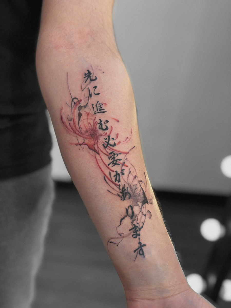 Такие татуировки смотрятся особенно волшебно, когда в них переплетаются: 🌸Паучья лилия — символ мистики и красоты, её изящные лепестки словно созданы для акварельной техники 🌸Иероглифы, которые добавляют композиции глубину смысла. Каждая такая работа — это маленькое произведение искусства, где акварельные переливы оживляют лепестки лилии и придают иероглифам особое очарование. Результат получается поистине завораживающим! #tattoorealism #японскаятату #татумосква