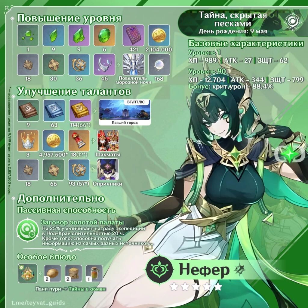 ㅤНефер нужно набирать много мастерства стихий, а также ей понадобятся крит. показатели. Крит. урон у неё повышается при прокачке уровня, но изначального значения будет недостаточно, так что следует искать оружие на крит. показатели или мастерство стихий.