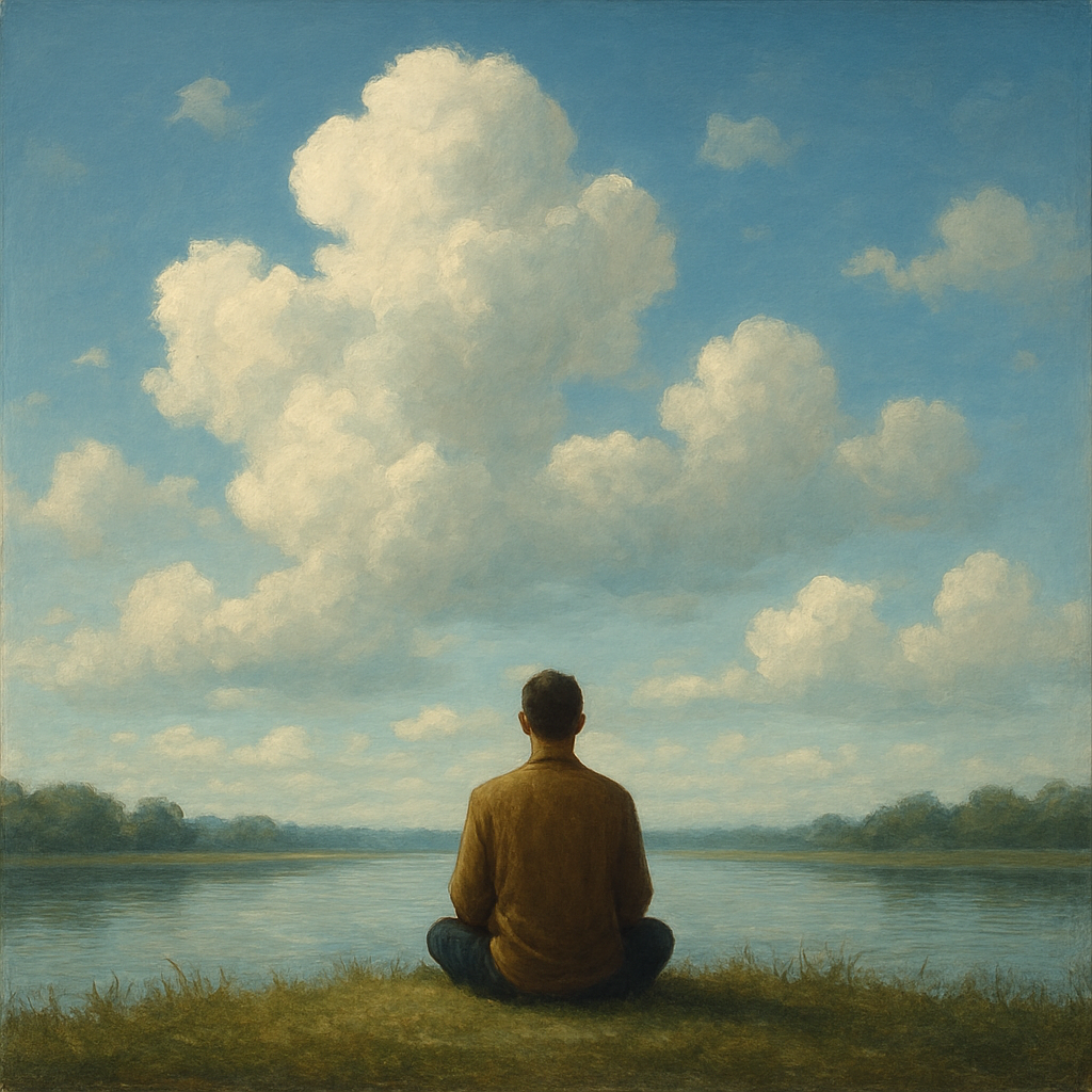 Мышление невозможно остановить усилием — ведь сам импульс «остановить» уже есть мысль. Это как пытаться схватить ветер руками: чем сильнее стараешься, тем больше он вырывается. Сознание — как бездонное небо. Мысли — облака, проходящие по нему. Иногда небо затянуто густыми тучами, и кажется, будто оно исчезло. Но стоит взглянуть внимательнее — за всеми облаками всегда есть простор, прозрачный и тихий. Он никуда не пропадает, просто внимание слишком увлечено движением форм. Так же и в нас. Мы не можем приказать мыслям исчезнуть, но можем перестать быть их пленниками. Вместо борьбы — наблюдение. Когда появляется мысль, не нужно её гнать или судить. Достаточно заметить: «Вот она». В этот миг возникает пространство между тобой и ею. Можно представить, что ты сидишь у берега реки и смотришь, как вода несёт листья. Каждый лист — мысль, воспоминание, оценка, план. Если пытаешься поймать их, неизбежно оказываешься в потоке. Но если просто наблюдаешь, река течёт сама, а ты остаёшься неподвижн