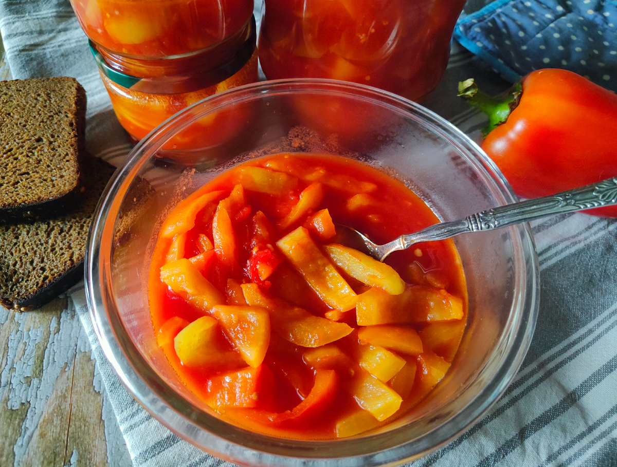 На канале уже был рецепт лечо, но тот вариант больше для любителей полезного питания, как говорится "ничего лишнего". То лечо по вкусу больше напоминает свежий овощной салат: А если хочется лечо пикантного, остренького? Рекомендую приготовить его по описанному ниже пошаговому рецепту. Уверена, вам понравится! 😋 - перец сладкий 1 кг - помидоры свежие 700 г - перец острый 1/2 шт. или по вкусу - чеснок 4 зубчика - масло рафинированное 2 ст.ложки - уксус натуральный винный или яблочный 1 ст.ложка - сахар 30 г - соль 15 г Для рецепта берите спелые перцы: жёлтые, красные и мясистые сезонные томаты. Указан вес неочищенных овощей. Начинаем с томатов. Тщательно их моем, надрезаем крест-накрест, опускаем в кипящую воду и бланшируем примерно 3 минуты. Перекладываем в миску с холодной водой: Снимаем кожицу, вырезаем место прикрепления плодоножки, режем на части: Измельчаем до состояния пюре, используя блендер или мясорубку: ☝️Сразу берите кастрюлю побольше, чтобы перцы тоже поместились. У м
