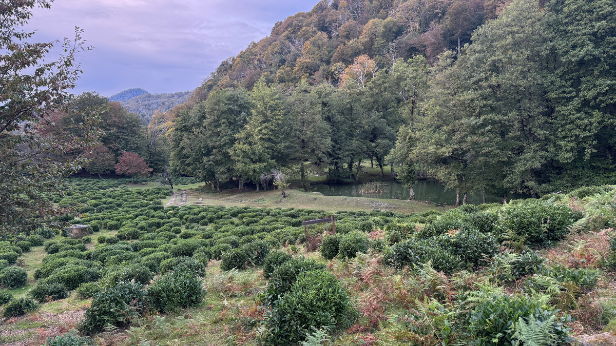 Весной мы впервые попали сюда — на тихую поляну среди чайных холмов. Воздух здесь будто чище, голова отдыхает. Пруд, сарай, аккуратный домик — всё как на картинке. Казалось, нашли место, где можно просто быть и слушать, как ветер шуршит по листьям чая. Осенью вернулись — и настроение резко поменялось. Домик сгорел. Остались только обгорелые стены. Очень жаль. Позже узнали, что вроде как этот дом специально строили для фильма «Снежный человек». Съёмки проходили летом 2024 года под Сочи, в районе Красной Поляны. Фильм вышел в 2025-м и частично снимался именно здесь, среди тех же холмов. Стоишь на поляне, где недавно работала съёмочная группа, и ловишь странное чувство: теперь ты смотришь не кино — ты в нём находишься. Место съёмок находится чуть выше по склону, среди бесконечных зелёных террас. Чуть ниже — глэмпинги, чайные плантации «Возрождение» и небольшие базы отдыха. Но больше всего нас зацепила база отдыха “Ольховое озеро” — с прудом, беседками, банькой и добродушными живо