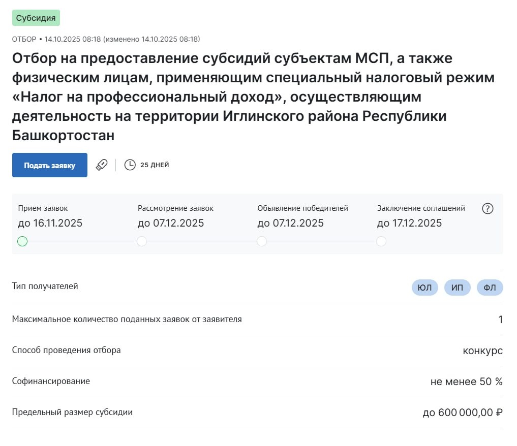Отбор на предоставление субсидий субъектам МСП, а также физическим лицам, применяющим специальный налоговый режим «Налог на профессиональный доход», осуществляющим деятельность на территории Иглинского района Республики Башкортостан 600 000 рублей при софинансировании не мнее 50% Срок приема заявлений: до 16.11.2025 года Подробности
