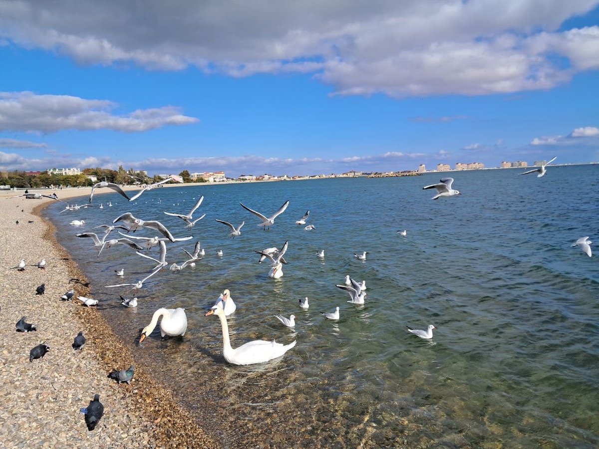 С наступлением зимы Евпатория преображается. Курортный шум стихает, уступая место умиротворяющей морской свежести и тихому шелесту волн. Но именно в это время года набережная обретает своих самых прекрасных и грациозных обитателей — стаи величественных лебедей-шипунов, для которых евпаторийский залив стал надежным зимним пристанищем. Теплая гавань для крылатых аристократов Традиция зимовки лебедей в Евпатории имеет давнюю историю. Умеренный климат Западного Крыма, незамерзающая акватория Каламитского залива и спокойные воды делают это место идеальным для пернатых гостей. В отличие от суровых северных зим, здесь они могут комфортно пережить холода, не тратя силы на изнурительные перелеты на юг. Ежегодно, с конца ноября по февраль, десятки, а иногда и сотни белоснежных птиц подплывают к самому берегу, становясь главной достопримечательностью города. Их изящные силуэты на фоне зимнего моря создают поистине завораживающее зрелище, привлекая как местных жителей, так и туристов. Традиция