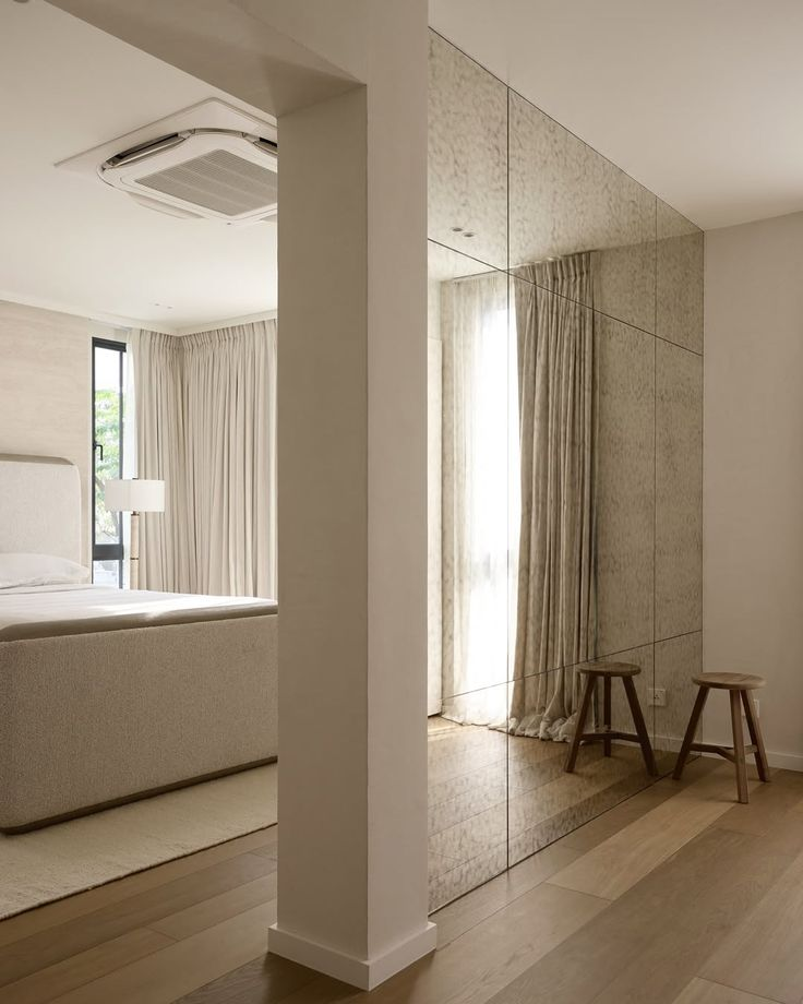 Как считает руководитель нашего бюро, лучше использовать гладкие зеркальные панели во всю высоту, утопленные в стену. Это создаёт ощущение “второго измерения” и делает интерьер более глубоким.