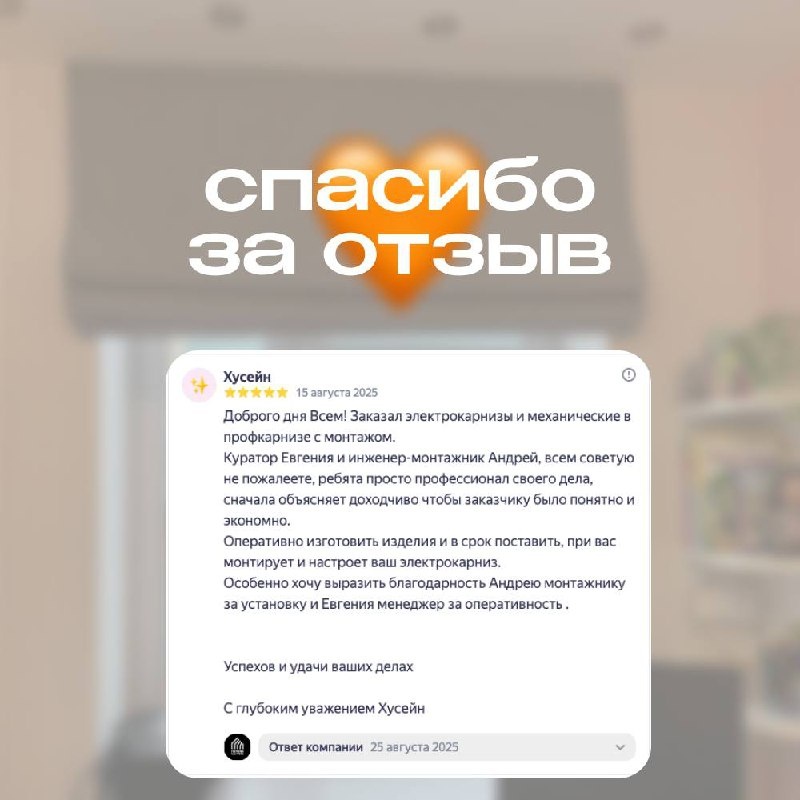 Как же здорово получать такие отзывы 🤩 Спа-си-бо, что так развернуто делитесь своим мнением 🫰🏻 Ведь мы стараемся, чтобы все сотрудники в компании были специалистами своего дела 💯 P.S. Задумали обновить свои карнизы или освежить шторы перед Новым годом? 🎄 Звоните: 📞8-800-100-18-66 или оставляйте свою заявку на нашем сайте