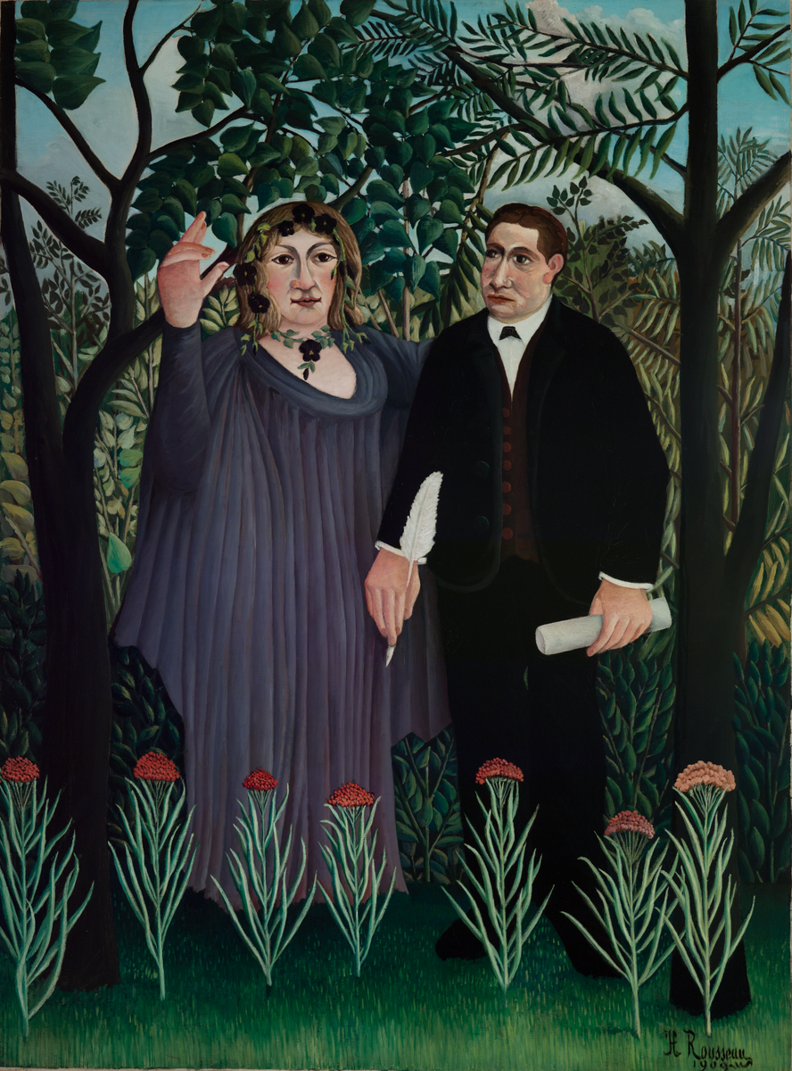 Анри Руссо — одна из главных фигур в исследованиях искусствоведа Марины Бессоновой, к 80-летию которой в Пушкинском музее приурочена выставка «Выбор Марины Бессоновой». Искусствовед, хранитель французской живописи XIX-XX веков, она была увлечена так называемым наивным искусством. В частности, отдельную статью Бессонова посвятила картине «Муза, вдохновляющая поэта (Поэт и муза)» Руссо, исследуя историю её создания в контексте творчества мастера. Интересно, что Бессонова связывает условность, лубочность изображения не со спецификой стиля художника-самоучки, как это делает большинство исследователей, но с самим методом его работы. Обратив внимание на сохранившуюся фотографию, на которой Руссо стоит с кистью в руках на фоне незаконченного полотна «Муза, вдохновляющая поэта», она приходит к выводу, что, возможно, Руссо заимствовал метод работы у современных ему фотографов. На фотографии мы можем заметить тщательно прописанный до мельчайших деталей фон картины, тогда как фигуры полностью о
