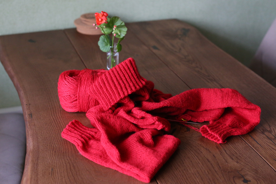 А давайте, как в сериале "Коломбо"? Сначала я расскажу, как было совершено это вязальное преступление, а потом мы вместе пройдёмся по тяжёлому пути героя и мотивам, побудившим его всё это совершить. Итак, мы на месте преступления. Что мы видим? Кто-то (да ладно: это я) оставил на столе свитер. Прекрасный красный свитер. Оставил в таком странном неполном состоянии: рукава есть, ворот есть, о ужас, а где же остальное?! А остального не будет. В этом и есть преступление. Конец первой части. Часть вторая, от лица героя, совершившего упомянутое деяние. Время: несколько лет назад. Приезжает коробка с пряжей из Великобритании. В ней много разноцветных бобин, но всех затмевает одна - красная! Так зарождается мечта о красном свитере. Самом простом и классическом. Но как только я собиралась вязать из красной бобины свитер, сразу становилось жалко тратить эту чудесную пряжу, так идеально подходящую для сложных жаккардов, на однотонное изделие, которое как тысяча других таких же в магазинах. А пря