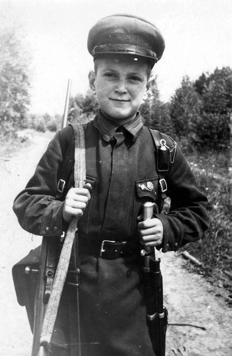 12-летний Витя, октябрь 1942 года Родители Вити погибли на войне, мальчик стал носить униформу советского разведчика в качестве сына полка. Ему подарили 2 нагрудных значка: парашютист и осоавиахимовец (общество содействия обороне, авиационному и химическому строительству). Фото было снято корреспондентом газеты «Красная Звезда» Олегом Кноррингом. ⭐️ Календарь Победы