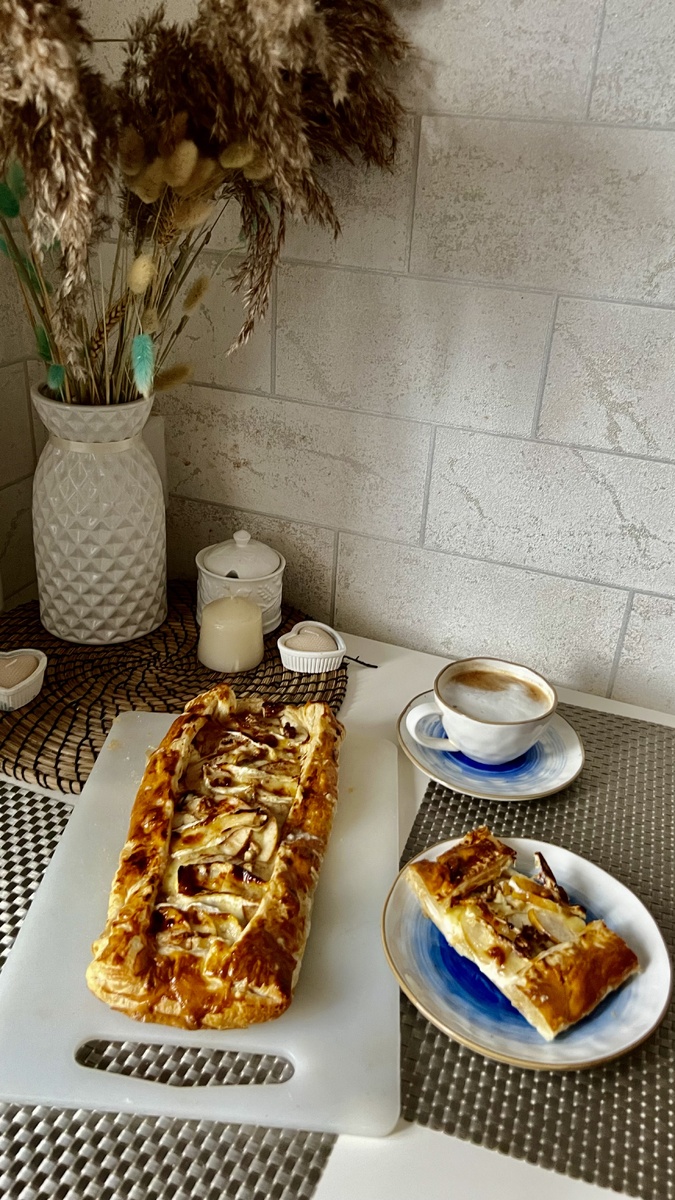 Осень — время тёплых ароматов и уютных вкусов. Предлагаю вам приготовить простой, но очень вкусный пирог с грушами, мёдом, корицей и нежным сыром камамбер на основе слоёного теста. Это блюдо идеально подойдёт как для семейного чаепития, так и для праздничного стола. ▎Ингредиенты: • Слоёное тесто без дрожжей — 1 упаковка • Спелые груши — 3 шт. • Мёд — 50 г • Корица — по вкусу • Творожный сыр — 100гр • Сыр камамбер — 1 шт • Измельчённые грецкие орехи — по желанию • Яичный желток — 1 шт. (для смазывания) ▎Важный лайфхак с раскаткой теста: Чтобы слоёное тесто хорошо поднялось и запеклось равномерно, раскатывайте его в одну сторону, не меняя направления движения скалки. Это поможет сохранить слои и воздушность теста. ▎Приготовление: 1. Подготовка теста: Разверните упаковку со слоёным тестом и аккуратно раскатайте его в одну сторону до желаемой толщины. 2. Нанесение творожного сыра: Равномерно смажьте поверхность теста творожным сыром. Это создаст нежную основу и добавит кремо