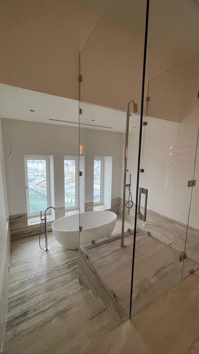 Ванная комната с окнами в пентхаусе ЖК Большая Дмитровка IX Как вам такое решение со ступеньками? Не опасно спускаться с мокрыми ногами по ним ? Пентхаус стоит к слову 1,6 млрд р