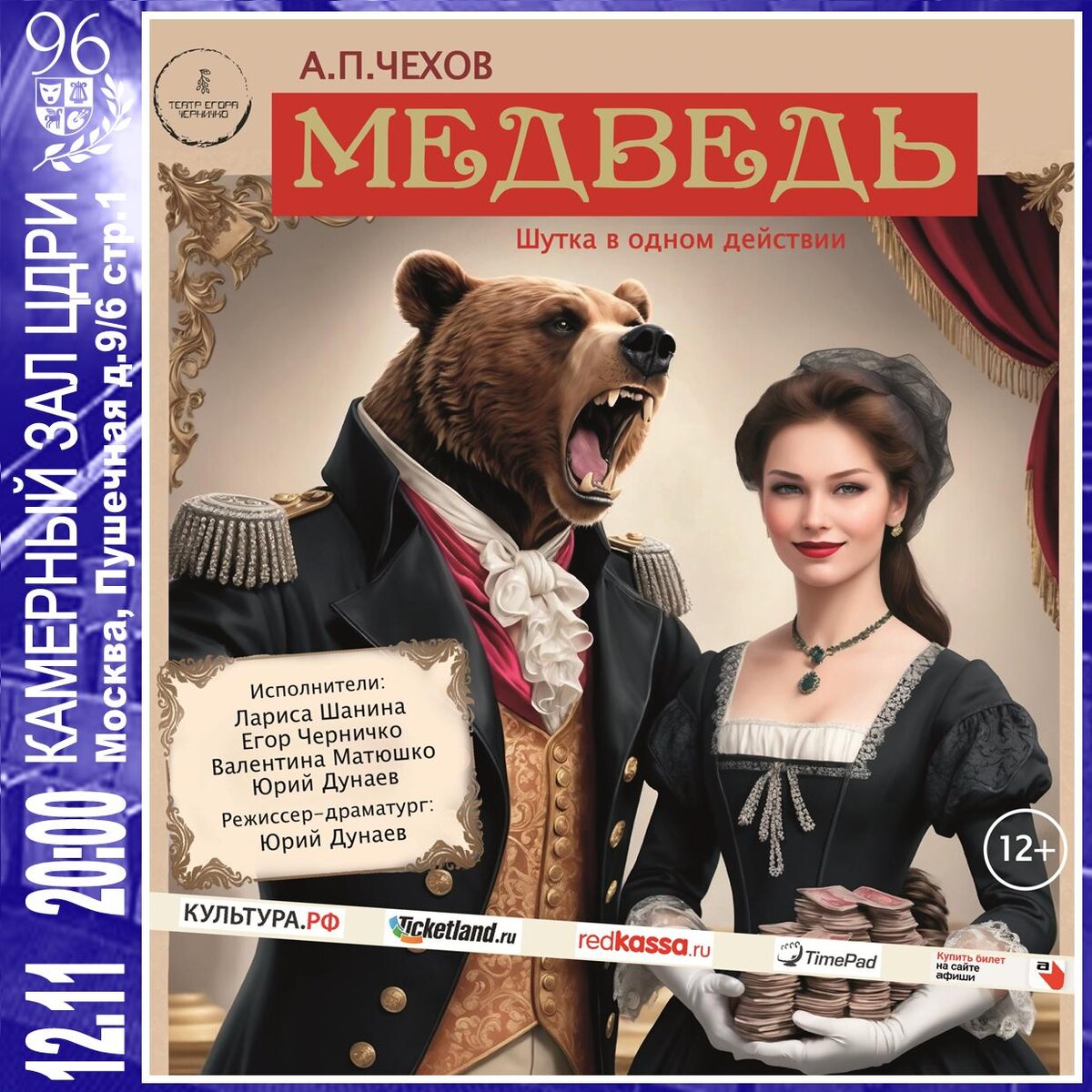 Шутка в одном действии Смех сквозь слезы: как «медведь» и «траурная вдова» нашли друг друга. Водевиль «Медведь» — это искрометная история о том, как даже в самом глухом углу жизни, где герои ведут себя подобно диким зверям, судьба может преподнести неожиданный подарок. Грубоватый землевладелец Смирнов, напоминающий медведя, и эксцентричная вдова Попова, запершая себя в трауре, сталкиваются в дуэли не только пистолетов, но и характеров. Их яростный спор о долгах, чести и любви превращается в фарс, где за внешней грубостью скрывается тонкая игра чувств. С момента создания 28-летним Чеховым пьеса покорила зрителей сочетанием житейской правды, психологической глубины и безудержного комизма. Первые рецензенты писали: «В этой шутке — вся гамма человеческих эмоций: от отчаяния до восторга, от фарса до лирики». В спектакле вас ждут: