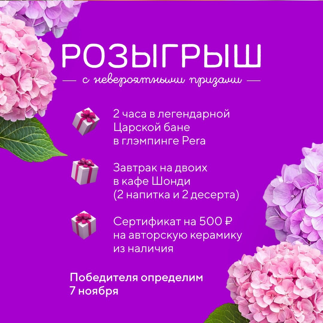 🎉 РОЗЫГРЫШ ВКонтакте с невероятными призами!🎉 🌲 Баня, вкусный завтрак и керамика — идеальный рецепт отдыха для души и тела! Друзья, вместе с Наташей Поповой мы подготовили для вас атмосферный и очень щедрый розыгрыш! Если вы мечтаете вырваться из городской суеты, вдохнуть чистый воздух, насладиться настоящей баней и вкусным завтраком, вам точно сюда 🙌 Что разыгрываем? ✨ 2 часа в легендарной Царской бане в глэмпинге Pera ✨ Завтрак на двоих в кафе Шонди (2 напитка и 2 десерта) ✨ Сертификат на 500 ₽ на авторскую керамику из наличия (можно выбрать на месте) ⭐️ Как принять участие. читайте в посте 🎉 Победителя выберем случайным образом среди подписчиков обоих сообществ, кто выполнит ВСЕ условия — 7 ноября 🏆 Не упустите шанс устроить себе день, который запомнится надолго! 🍃Участвуйте сами и приглашайте друзей — пусть эта осень будет тёплой и вкусной! Pera #pera92_розыгрыш