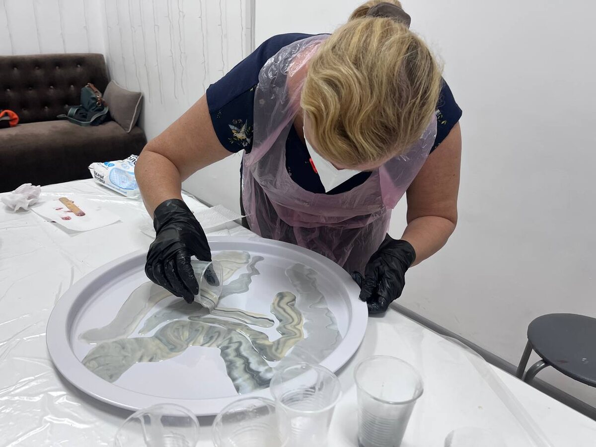 🎥 На видео — журнальный столик в нежных тонах. Его сделала женщина без опыта в рисовании смолой. Пришла по подарочному сертификату, который ей подарила подруга. И, как это часто бывает, подруга в итоге тоже пришла на мастер-класс — за компанию 😄 И сделала свой столик, тоже в нежных оттенках.