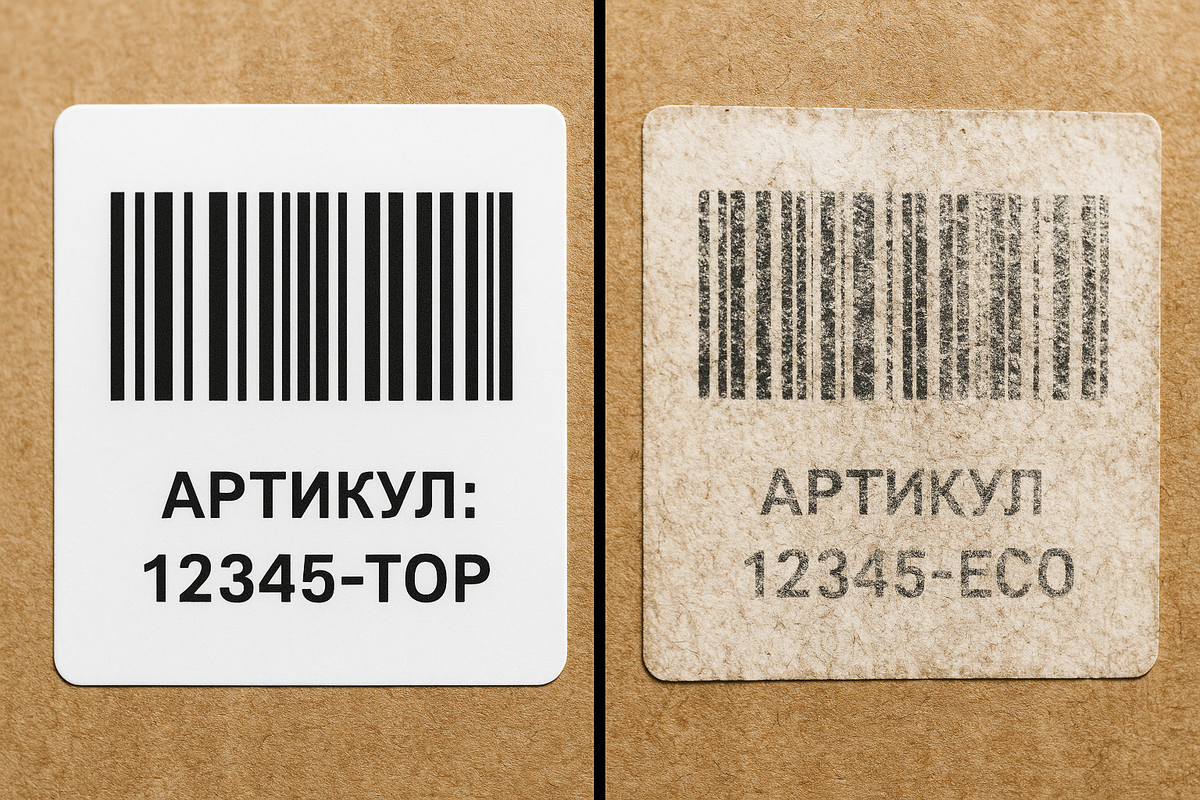 Термоэтикетки — рабочие лошадки современного бизнеса. Мы сталкиваемся с ними каждый день: на товарах с маркетплейсов, на посылках в пунктах выдачи, на весовых продуктах в супермаркетах. Их популярность объяснима: для печати на них не нужны дорогие картриджи или риббоны (красящая лента), а только специальный термопринтер. Но за этой простотой скрывается важный нюанс, который делит все термоэтикетки на два типа — ЭКО и ТОП. Ошибка в выборе может привести к нечитаемому штрихкоду, возврату поставки и прямым убыткам. Чтобы понять разницу между ЭКО и ТОП, нужно сперва понять сам принцип. Внутри термоэтикетки находится специальный термочувствительный слой. Когда печатающая головка принтера точечно нагревает его, он темнеет, и так появляется изображение — текст, штрихкод, графика. Никакой краски, только нагрев. Это просто, быстро и дешево. Но именно этот слой и является главным героем и главной уязвимостью технологии. Этикетки типа ЭКО — это самый базовый и экономичный вариант. Они представляю