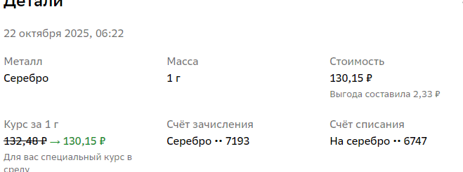 Добрый день! Вчера получила отпускные, вот распихала по копилкам. Плюсом сегодня пришли отпускные мужа, с его денег мне тоже перепало. Так что сегодня я в весомом плюсе. Обожаю получать деньги! Что получилось в итоге? По кредиткам: Итого по кредиткам - 48 528 рублей. На автокредит я собрала 25 тысяч на досрочный платёж! Ура! Начала собирать на следующий платёж. Можно было бы оставить на этот, побольше заплатить, но не стану. после отпуска будет тяжко, пусть деньги на платеж собираются. Тем более скоро новый год, совсем другие траты. И дни рождения! На резерв тоже собираю потихоньку. Уже набрала - 3 577 рублей) Осталось 400 с хвостиком, и я достигла первой микроцели. Но собрать - полдела. Нужно ещё сохранить. Это сложнее. Гораздо. Вот и копим. В том числе и в серебре. Сегодня - акция в Сбере- металлы дешевле. С утра купила 5 гр. Ради этого даже докинула 12 рублей с Дзен - заработок за неделю. Итого теперь 54 грамма. Покупала с утра серебро по этой цене - А оно теперь по 128 руб