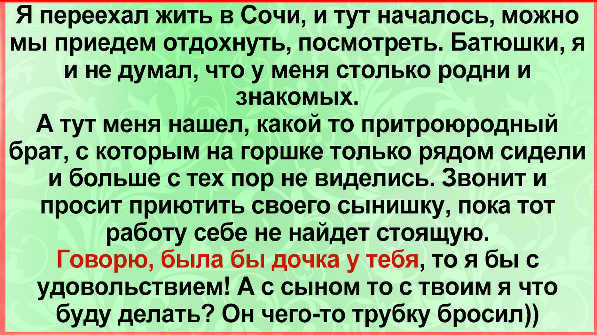 Не у всех, конечно, но в семье моего мужа так. Причем, помогает, почему-то только он😄). Значит, постепенно все узнают про квартиру, у него родни много, отказать не сможет, так что, чтобы нам с ним не ругаться потом, не нужна нам никакая квартира.