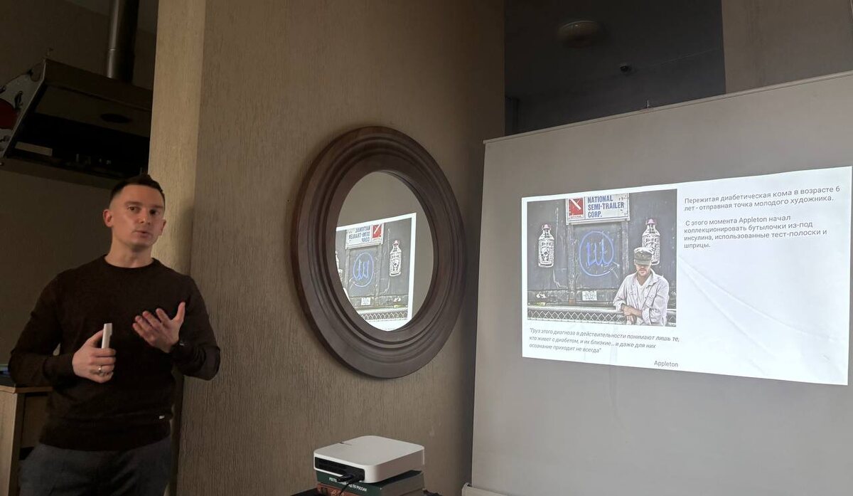 Сегодня в творческом пространстве ресторана «Onni» прошел круглый стол для врачей-неврологов. Это такой нестандартный способ профессионального общения - мини конференция, где один или два докладчика делают сообщения на 20-30 минут. Сегодня выступал вместе с Екатериной Васильевной Пархоменко, темой ее доклада стал позвоночник, а точнее его душа: «В центре внимания душа позвоночника», а мой доклад «Сладости и страсти» был посвящен проблематике сахарного диабета и влиянии этого заболевания на целый спектр неврологических заболеваний. Погружаясь в эту тему я наткнулся на творчество одного уличного художника - Appleton, с детства получающего инсулин и сохранившим все флаконы. Они и являются основным объектом его творчества. В выставках, уличных граффити и фотографиях он выражает проблемы пациентов с диабетом и пытается привлечь внимание к этой болезни. А проблема достаточно серьезная, почти каждый десятый человек в мире страдает этим недугом. Так или иначе я коснулся 7 заболеваний