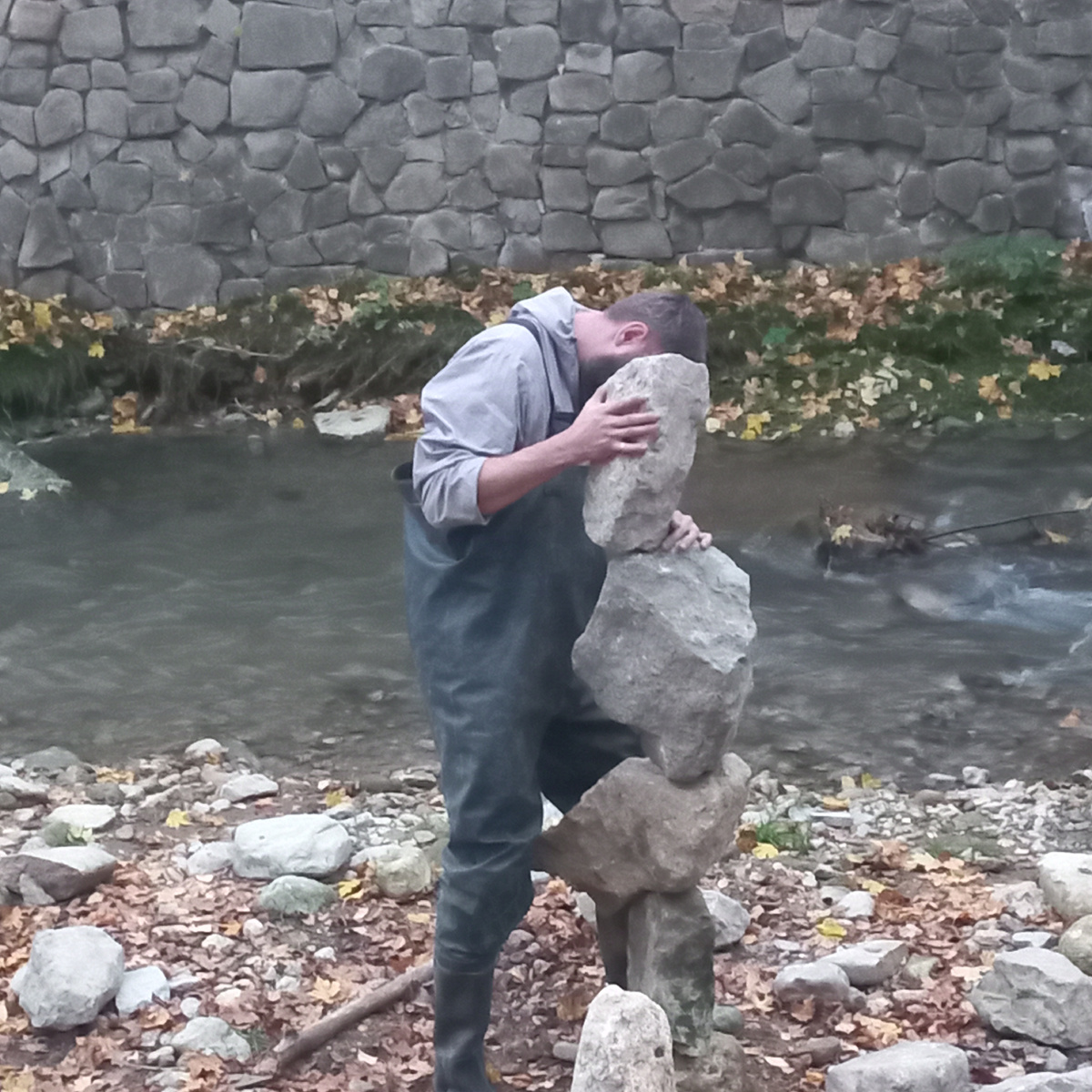 Да, я об этом часто думала в разные периоды своей жизни.И не всегда он находился...По разным причинам. А вот то, что делает с камнями этот человек у реки Ольховки, вызывает восхищение и неизменный интерес у прохожих, отдыхающих в Кисловодске. Достойное и любопытное зрелище. Я тоже не прошла мимо.Остановилась посмотреть, как человек в непромокаемом комбинезоне показывает настоящее шоу. Виталий( так зовут мастера) виртуозно, но совсем не торопясь, ставит огромные булыжники и маленькие камни один на другой, и они стоят,образуя своеобразные пирамидки. И, кроме того, ему присуще прекрасное чувство юмора, чем он пользуется, развлекая людей шутками-прибаутками. Видно, что это ему самому всё это действо очень нравится, притягивая внимание окружающих, гуляющих в парке. Это так здорово, когда у человека есть увлечение. Кто-то собирает марки, кто-то вяжет крючком, я делаю крошечных ангелов, а человек собирает из камешков разной формы невероятные пирамидки... Виталий 11 лет назад увлекся ме