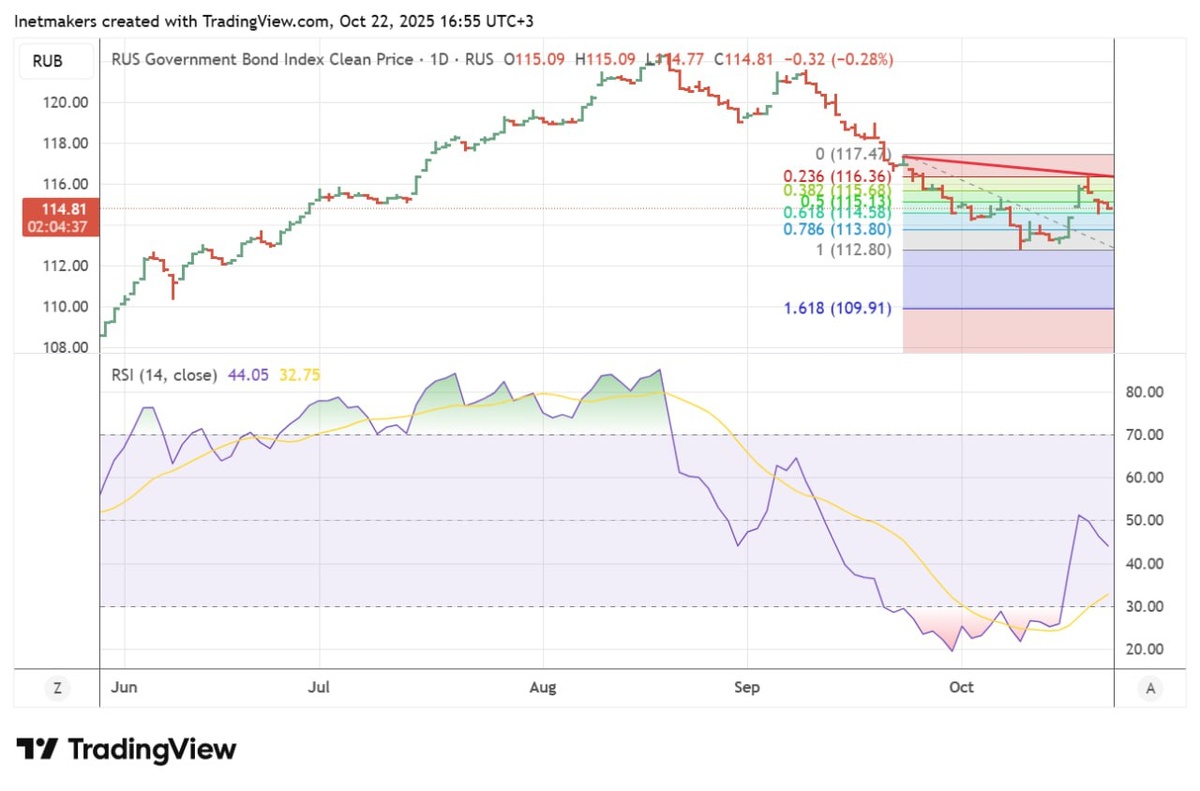 Индексу RGBI не удалось закрепить тренд к росту, он развернулся вниз, сформировав медвежью техническую модель, это говорит о том, что Банк