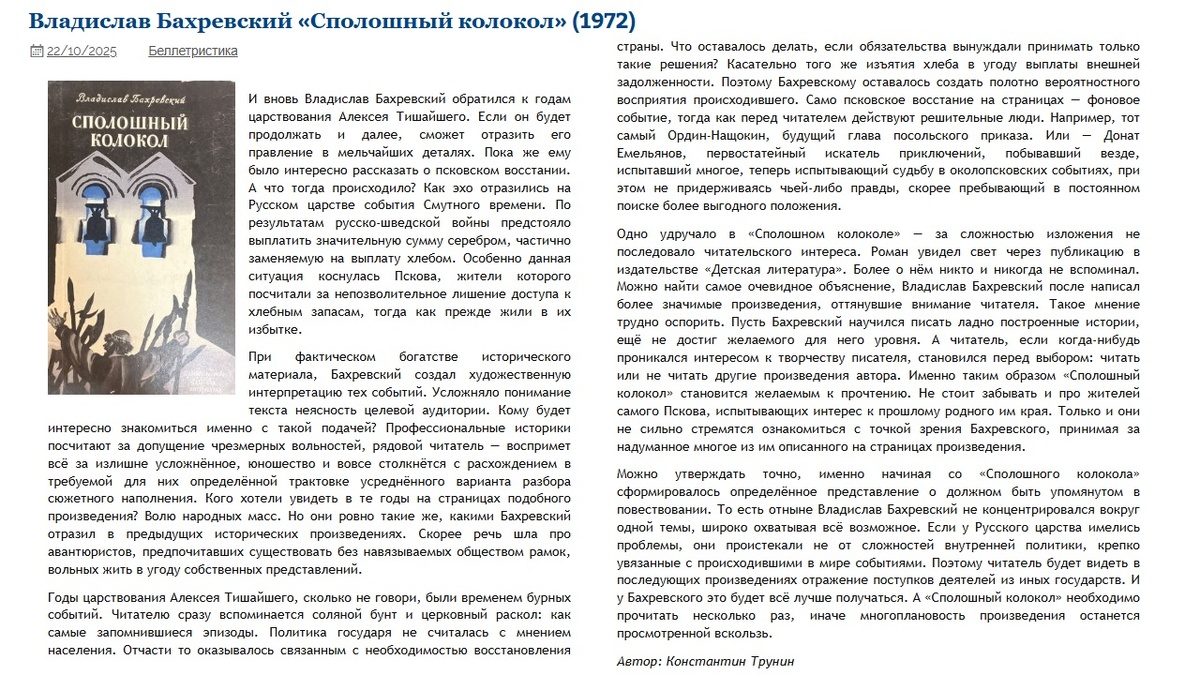 Владислав Бахревский "Сполошный колокол" (1972) | Критика