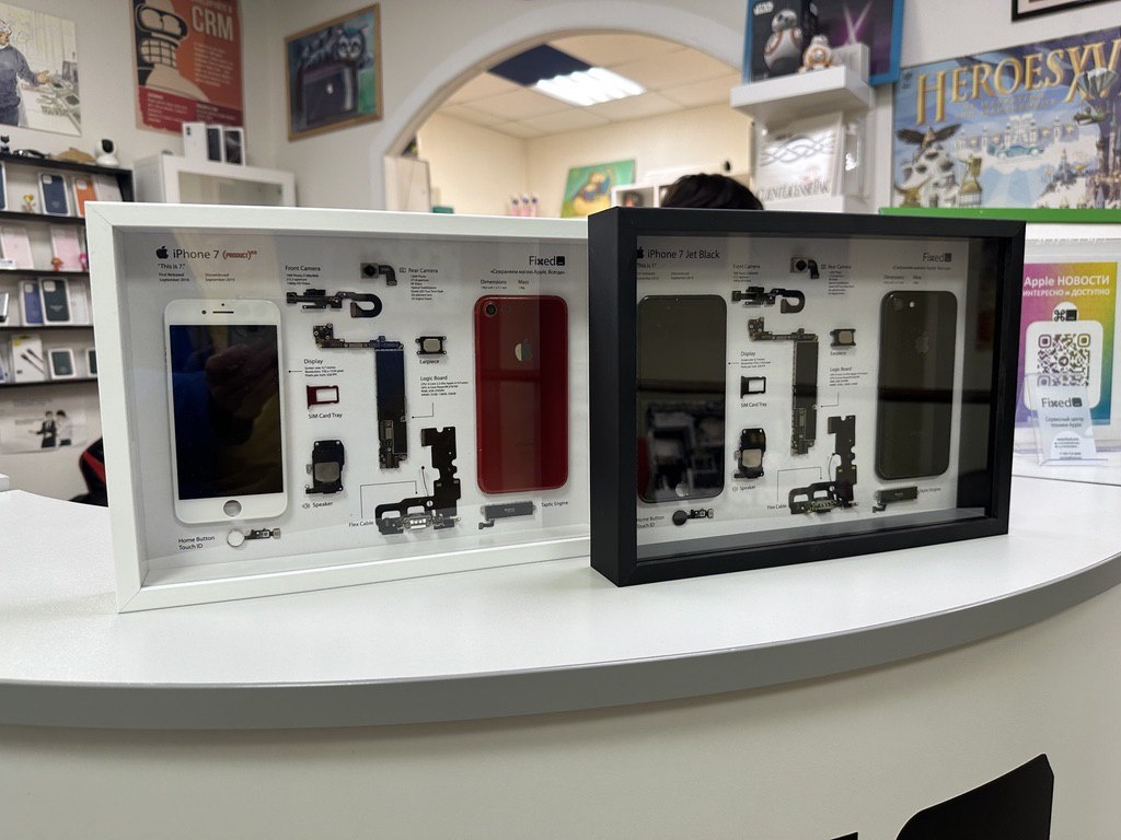 Вчера к нам зашел человек на установку ЭЦП на Мак (мы помогаем с этим бесплатно ибо считаем некой соцнагрузкой). Пока суть да дело, увидел наши фрейм-арты с «семерками» и... сперва купил уникальный красный вариант, а потом подумал, и черный тоже забрал. В срочном порядке пришлось доделывать макет на «восьмерки», чтобы что-то на витрину поставить. Теперь у нас в активе есть варианты на iPhone 4, 4S, 5, 5c, 5S, 7 и 8, так что если кому что надо — говорите. Ну и напоминаем, что фрейм-арт iPhone 5c можно выиграть в рамках нашего октябрьского розыгрыша. А также там на кону Макбук и книга. Подробности по ссылке — участвуйте сами и друзей зовите! @fixed