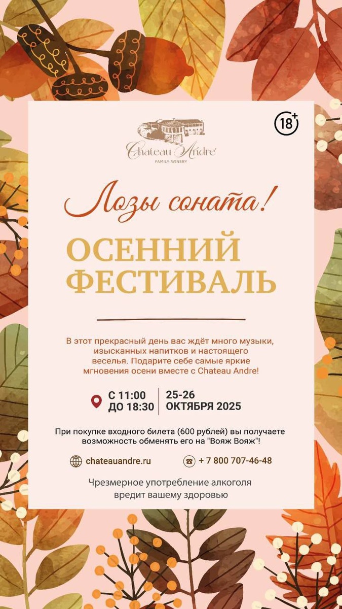 🍇 В Chateau Andre пройдет осенний фестиваль «Лозы соната» 📆 25 и 26 октября 2025 с 11:00 до 18:30 В этот прекрасный день вас ждет много музыки, изысканного вина и настоящего веселья. Подарите себе самые яркие мгновения осени вместе с Chateau Andre! Телефон для справок: 8(800)707-46-48
