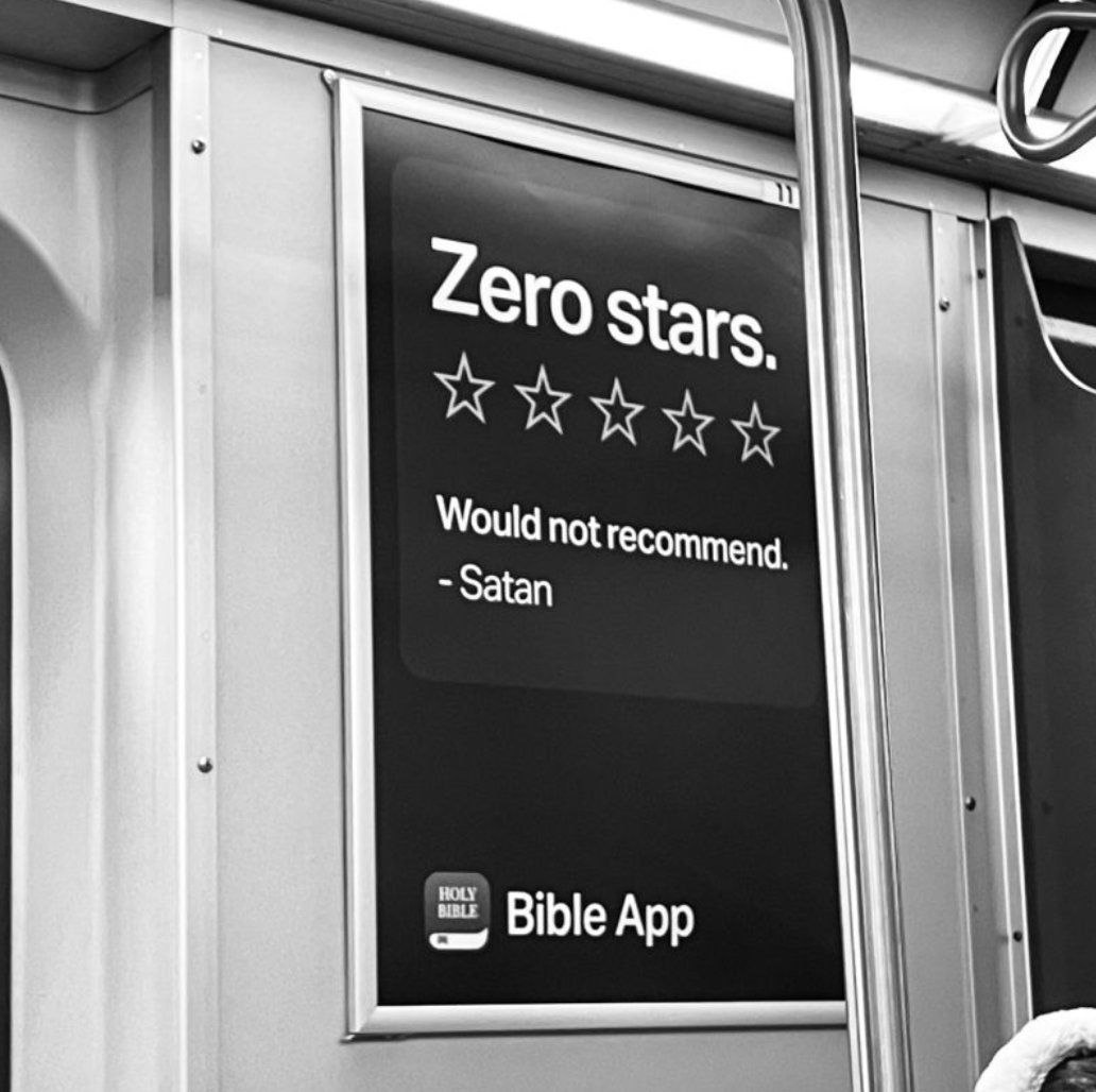 Ситуация: вы трясётесь в вагоне Нью-Йоркского метро, а напротив — плакат с чёрным фоном, на котором Сатана оставляет отзыв «Zero stars. Would not recommend» на приложение с Библией.