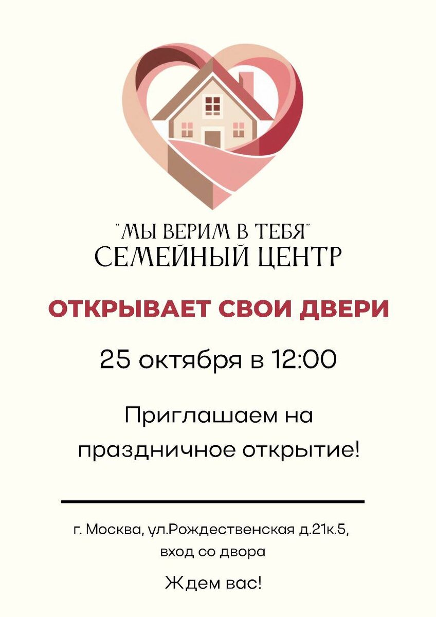🎉 Большое событие! Друзья, нам не верится, но это день настал... Мы рады пригласить вас на открытие семейного центра «Мы верим в тебя»! 📅 25 октября в 12:00 📍 Где: Москва, м.Некрасовка, ул. Рождественская, д. 21, к. 5, вход со двора. Это день, который мы хотим разделить с вами — с семьями, детьми, друзьями и всеми, кто верит в добро и поддержку🪷 В программе: ✨ весёлая анимация для детей 🎁 подарки и сюрпризы 🎨 творческие мастер-классы ☕ вкусные угощения, уютное общение и знакомство с нашей командой Семейный центр «Мы верим в тебя» — это место, где всегда тепло, где слышат, понимают и помогают. Здесь семьи, в том числе и с особенными детьми смогут получать поддержку, участвовать в программах, общаться и находить друзей. Приходите всей семьёй! Будет светло, душевно и по-настоящему по-домашнему 💛 Запись по телефону WhatsApp 89153980188