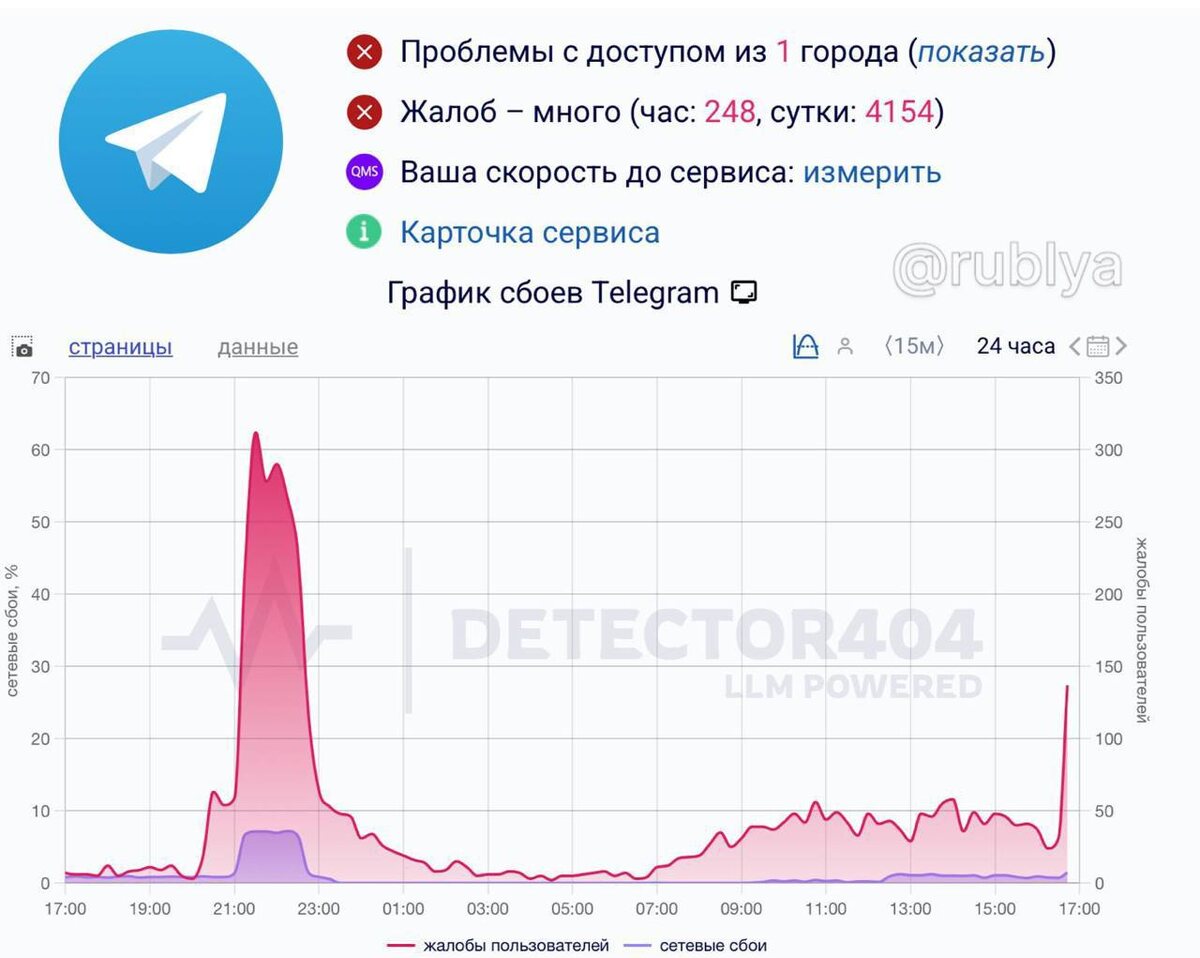 В ответ на пост Telegram упал по всей России — юзеры из разных регионов сообщают о массовом сбое. Пользователи не могут отправлять сообщения и загружать медиа. Мессенджер не работает ни на смартфонах, ни на ПК. Количество жалоб растет.